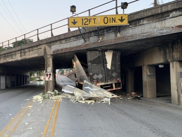 On Friday morning, the Kansas City Police Department (KCPD) shared photos of a semi truck whose driver attempted to squeeze under the 12 foot Independence Avenue Bridge.