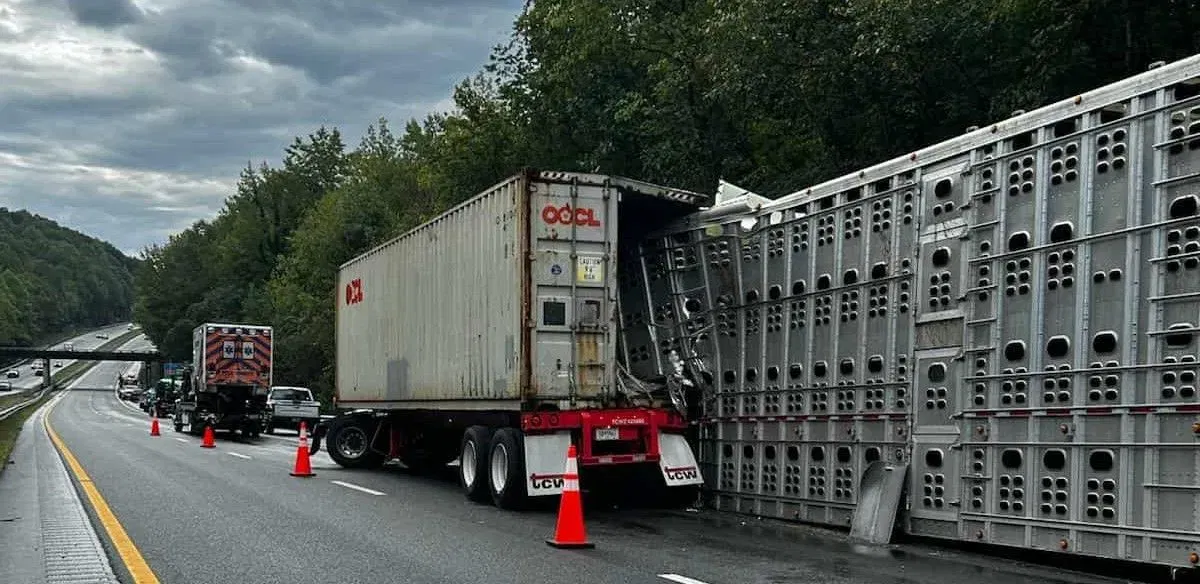 A multi-vehicle crash on Interstate 26 East in Polk County, North Carolina early on September 25 resulted in minor injuries and the death of two cows after two tractor-trailers collided with two Polk County EMS vehicles that were responding to a separate accident.