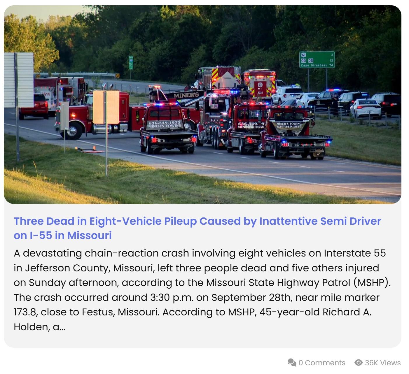 According to The Sun Holden made the statement to troopers after his 2022 Freightliner Cascadia plowed through five cars at full speed in slowed traffic on Sunday afternoon, near Festus, Missouri. His admission adds critical insight into the chain-reaction crash that left three people dead and four others injured — one still in critical condition.