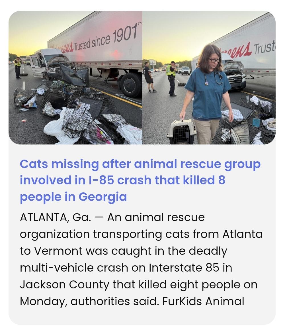 A van operated by Furkids Animal Rescue and Shelters was also involved, carrying 37 cats. The organization said its driver and several animals were injured, while five cats remain missing.