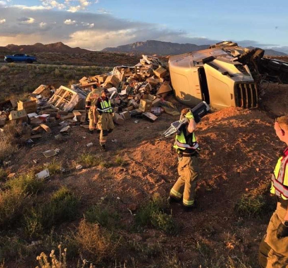 WASHINGTON COUNTY, Utah — A semi-truck hauling firearms and ammunition overturned Wednesday on northbound Interstate 15 near the State Route 9 junction, prompting a large emergency response to secure the cargo and clear the scene.