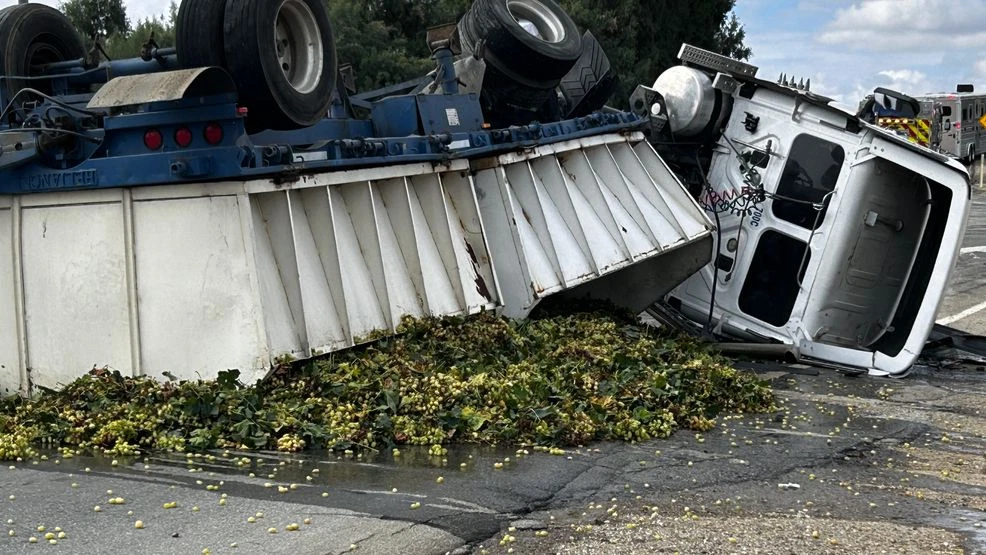 According to KBAK/KBFX, the trailers were carrying grapes, which scattered across the road following the crash. It was not immediately clear whether the driver was injured.