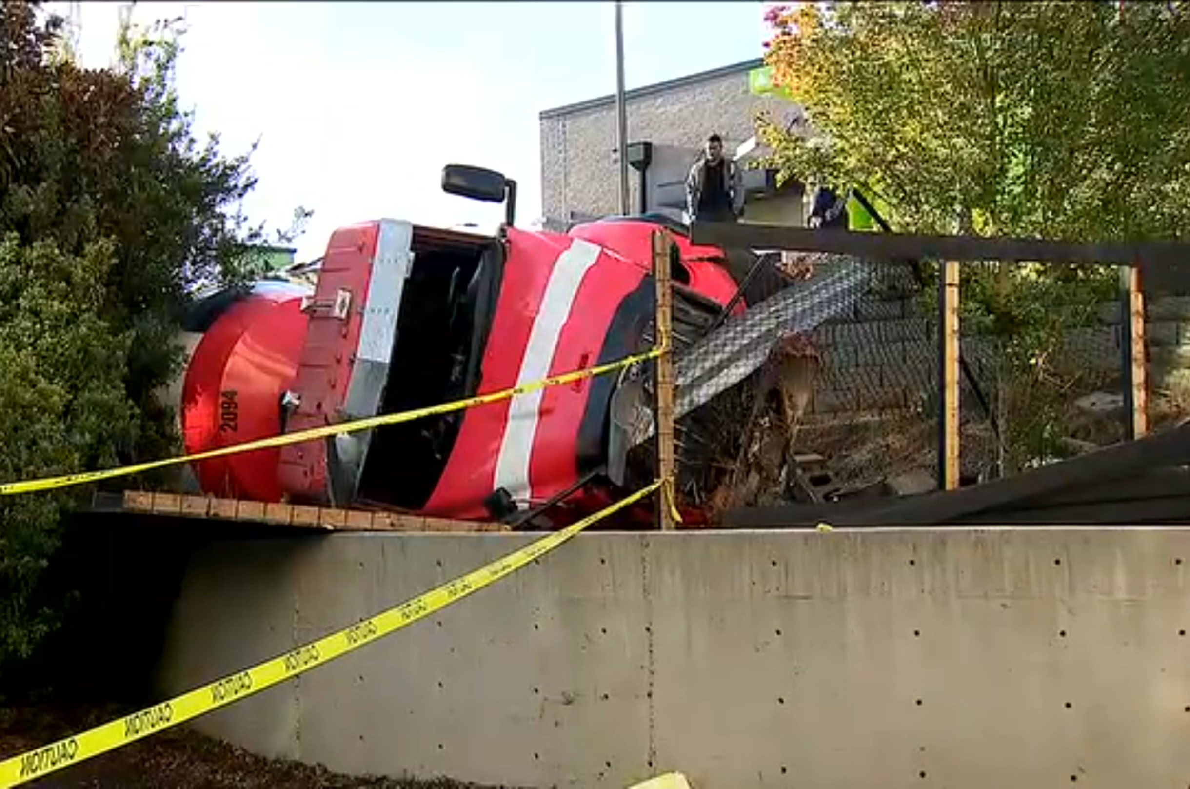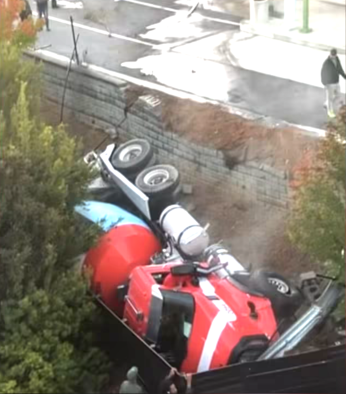 Photos from the scene show the overturned truck and a nearby concrete wall with significant damage. The cause of the crash remains under investigation.