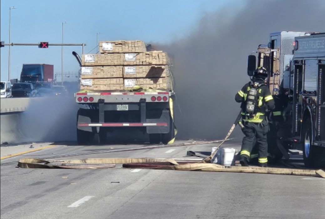 The crash occurred around 11:15 a.m. when a northbound Freightliner slowed for traffic congestion and was rear-ended by another Freightliner hauling lumber. The impact caused the lumber truck to catch fire, filling the bridge-tunnel with smoke.