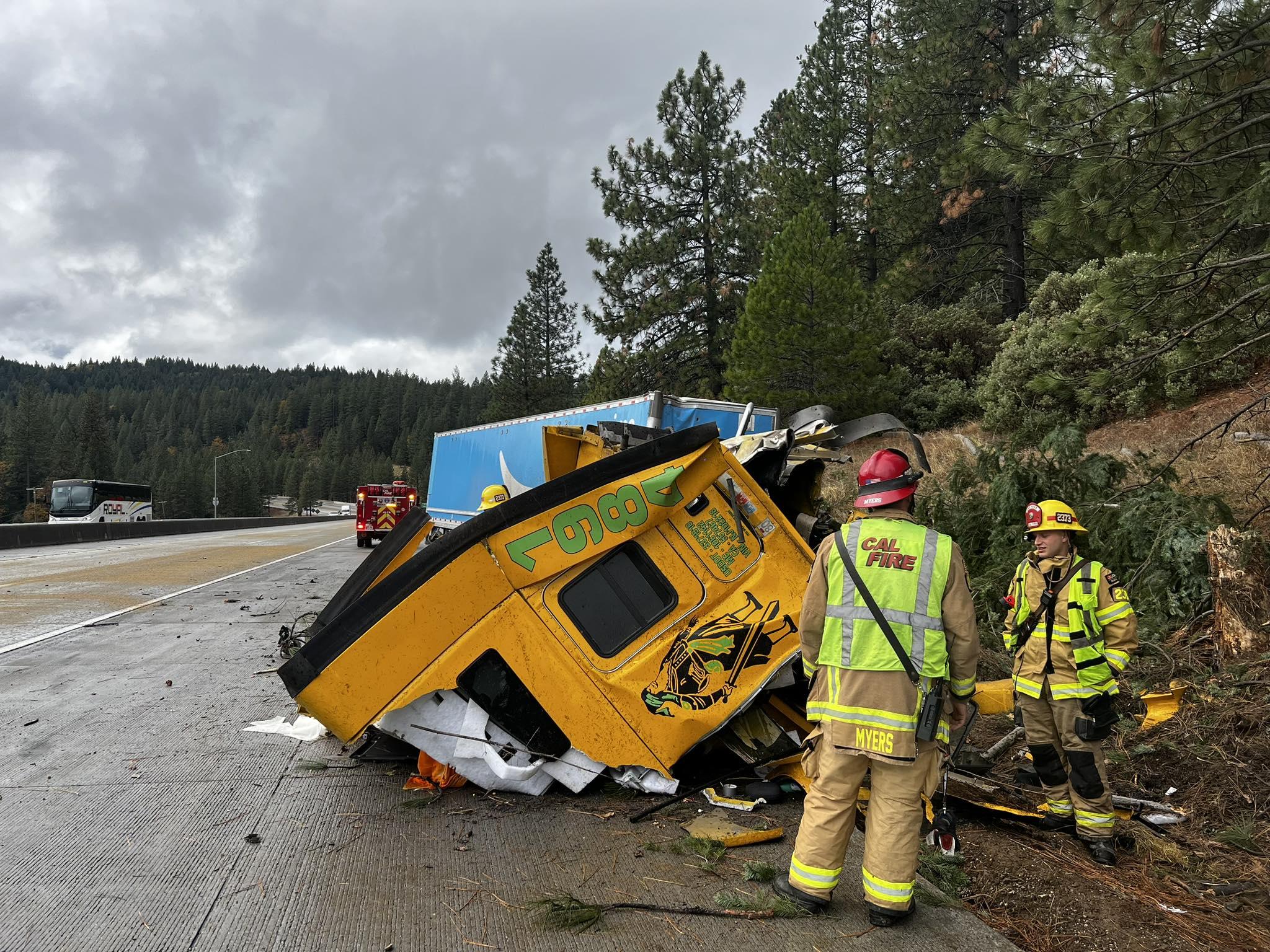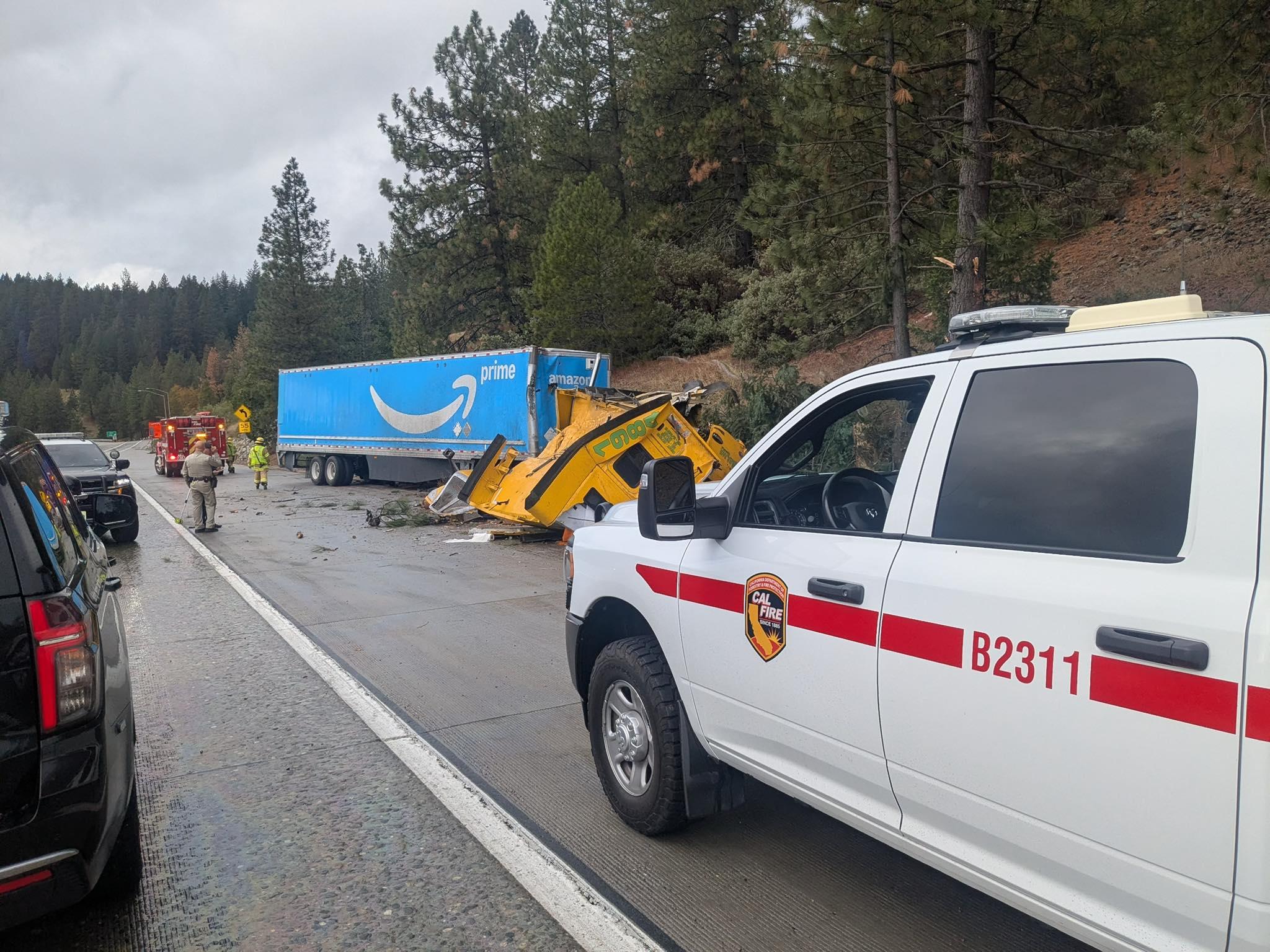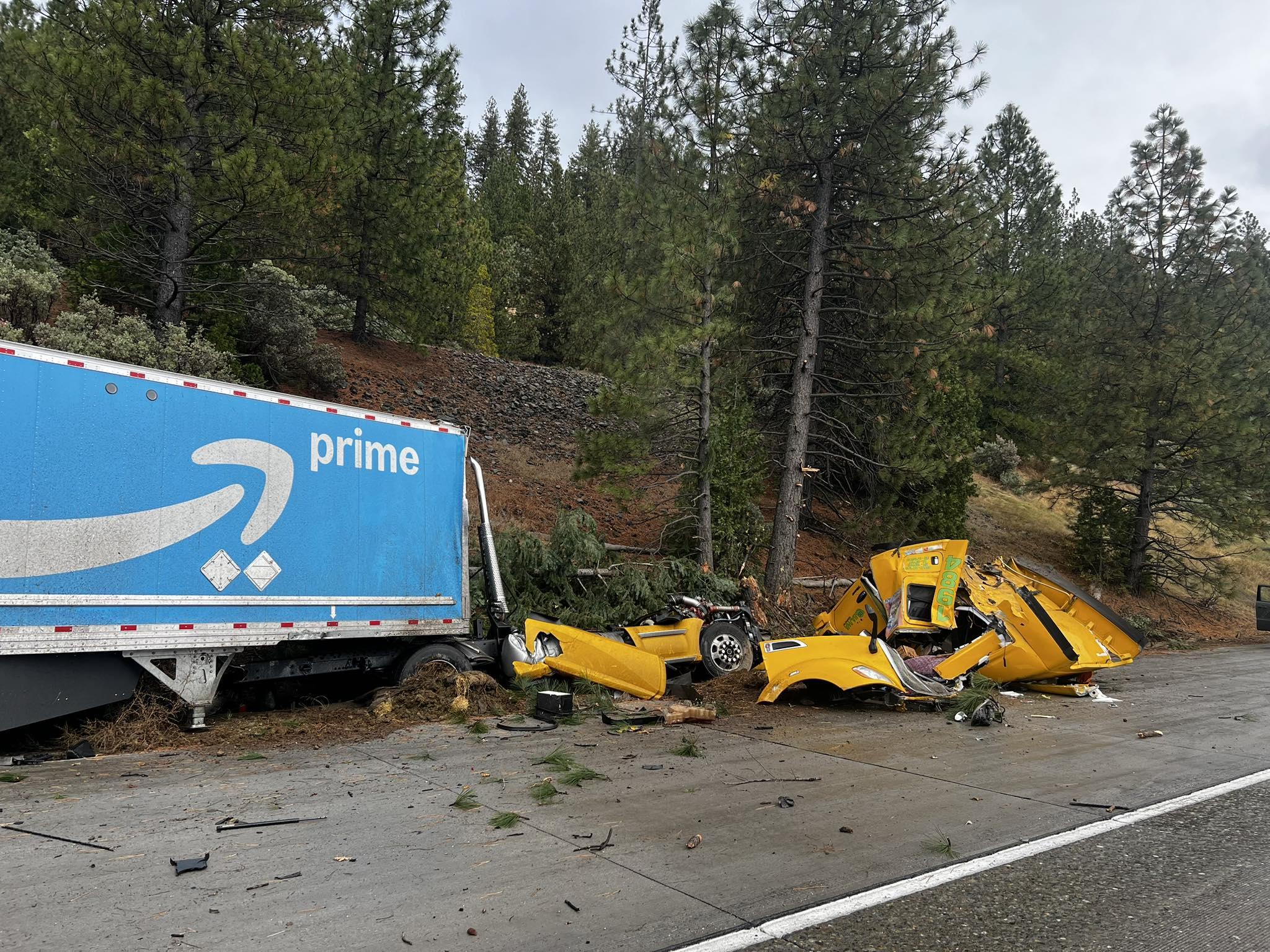 The crash happened around 11:45 a.m. on westbound I-80 when a dump truck spilled oil and fuel onto the highway. Moments later, a gravel truck veered off the road and crashed into trees, with the cab wrapping around a trunk. A third vehicle, an Amazon semi-truck, then lost control on the slick roadway and crashed near Alta Bonnynook Road.