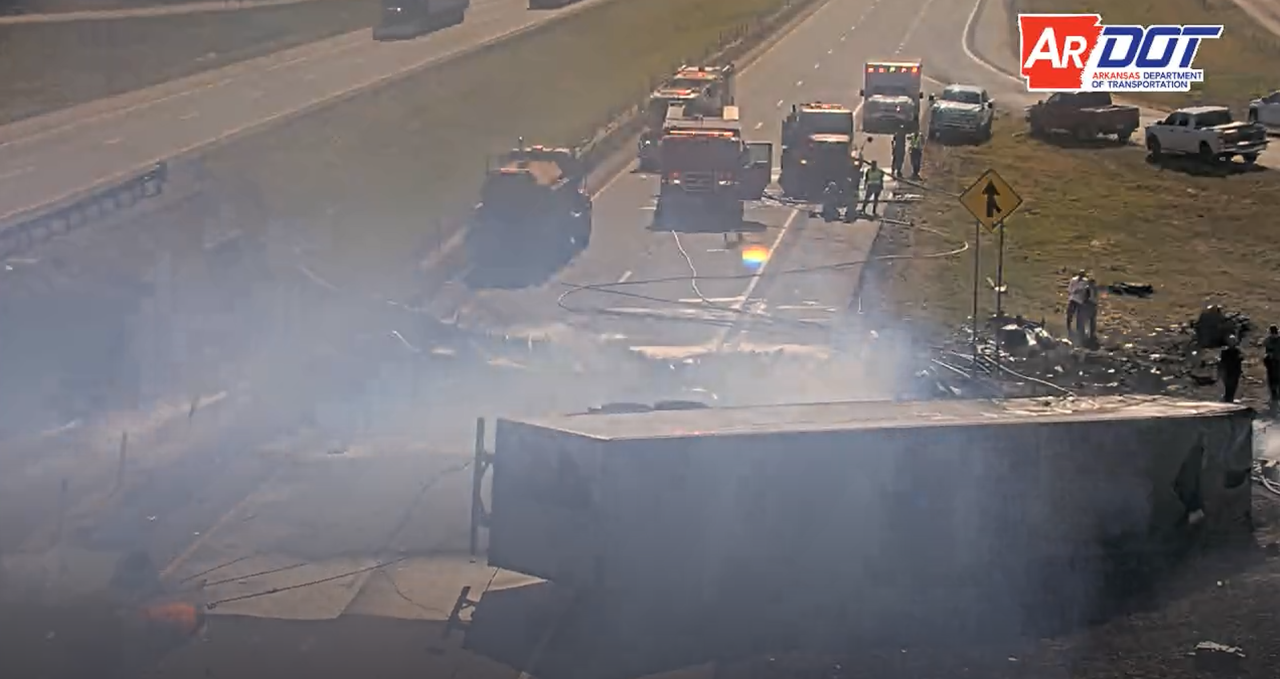 According to KARK, one tractor-trailer crossed the median near Gum Springs and struck another rig head-on, sparking a fire.