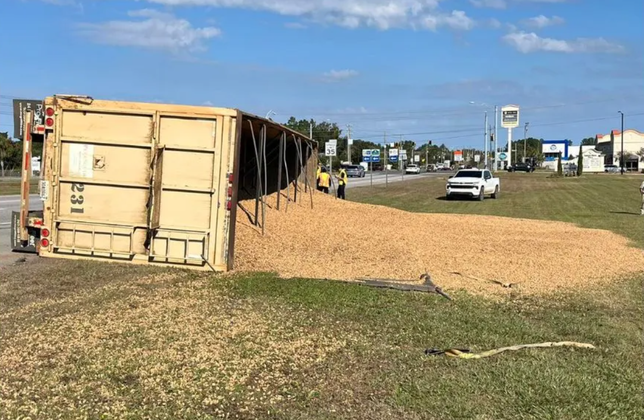 DAPHNE, Ala. — A tractor-trailer hauling peanuts overturned Friday morning in Daphne, spilling its load and causing traffic delays near the intersection of Highway 181 and Interstate 10.