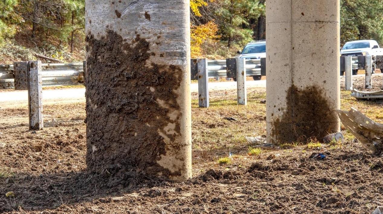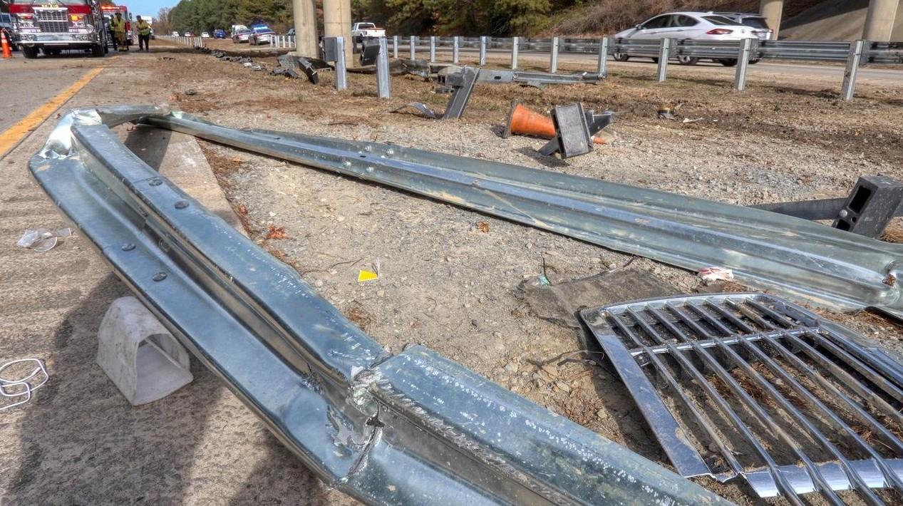 The truck veered off the left side of the highway into the median, struck the guardrail, and overturned, scattering garbage across the roadway and median. During the crash, the semi also sideswiped two concrete bridge support beams and destroyed a section of newly installed steel guardrail that had been put in just one day earlier.