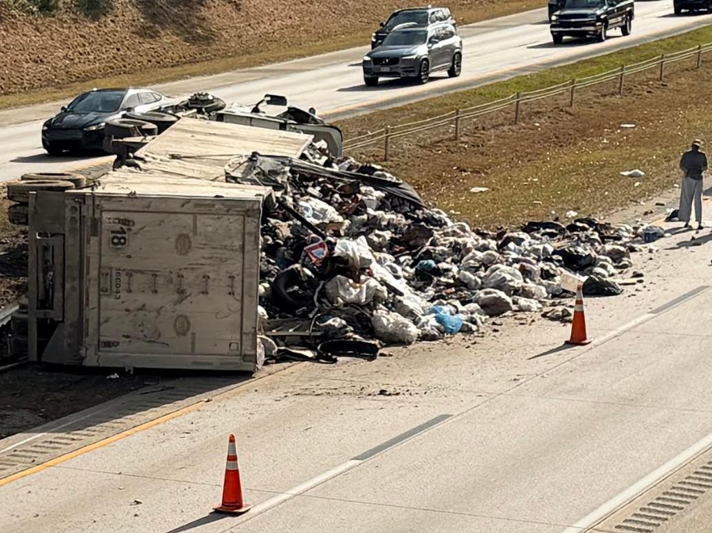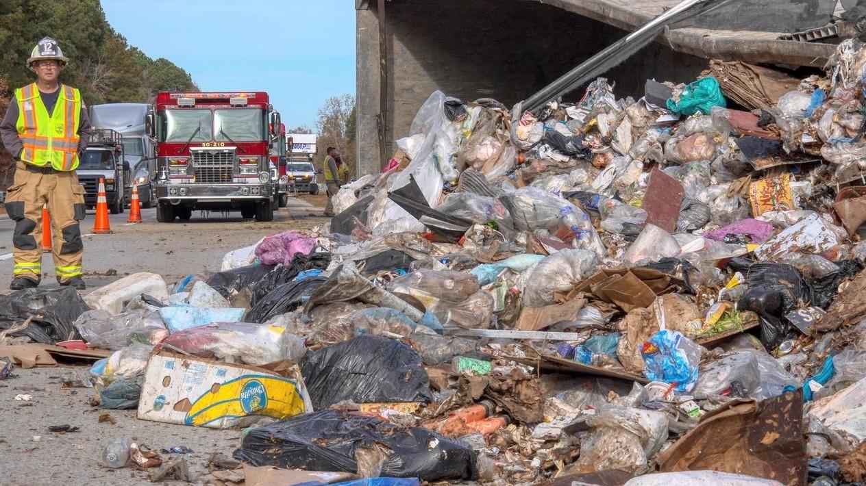 Semi hauling garbage overturns in Johnston County after tire blowout, spilling garbage and fuel