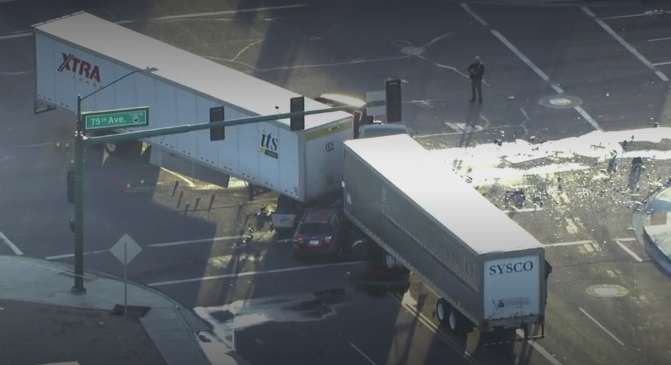 The incident began on I-10, where Arizona DPS troopers were investigating a hit-and-run crash. Moments later, the same SUV exited the freeway and continued at high speed into the West Valley, according to ABC15. At approximately 4 a.m., the SUV collided with two semi-trucks in the intersection. Video from the scene showed the SUV completely mangled, with its front end crushed beneath one of the trucks.