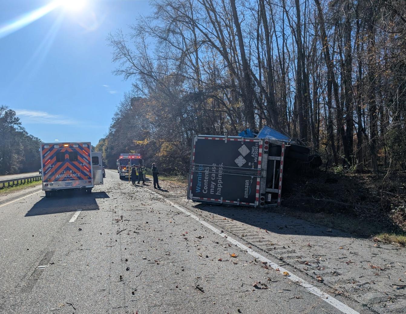 Tractor-trailer driver dies after overturning in single-vehicle crash on I-95 in Greensville County