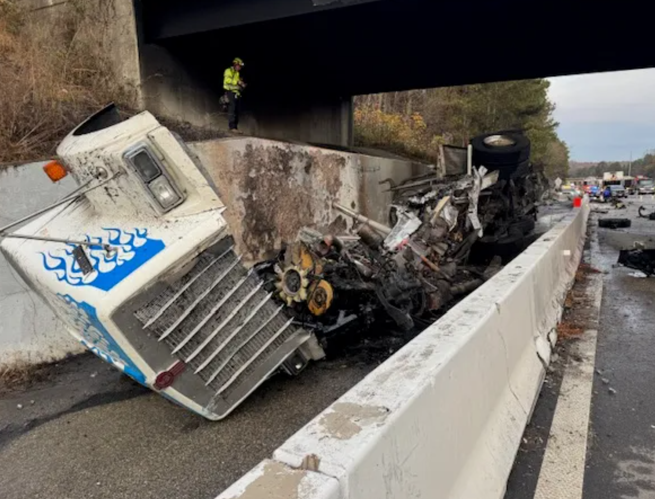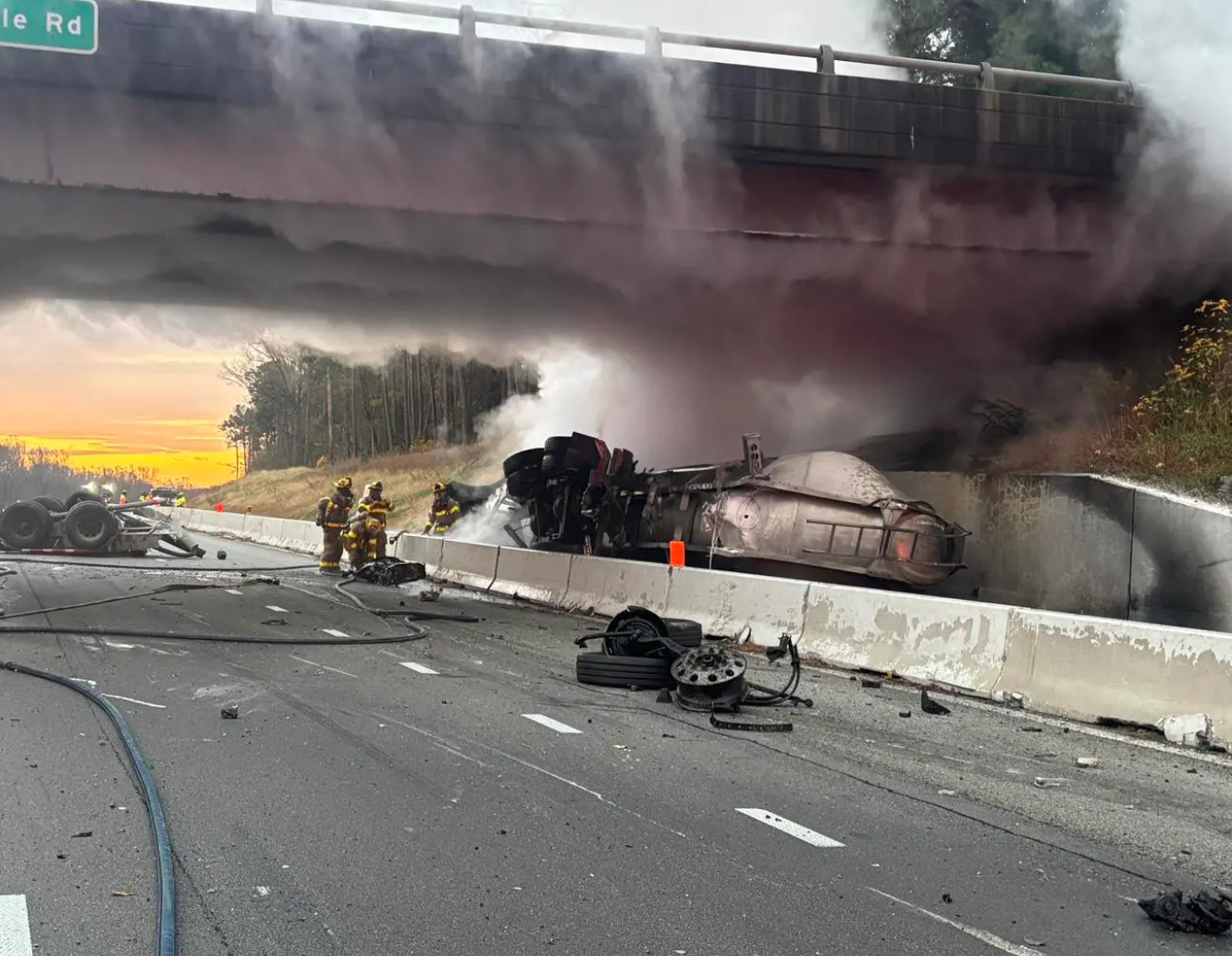 The crash happened around 6:46 a.m. near the Route 288 exit. Investigators said the tanker, which was hauling lime, was traveling southbound when it crashed over the jersey wall, overturned on the right side of the highway, and caught fire.