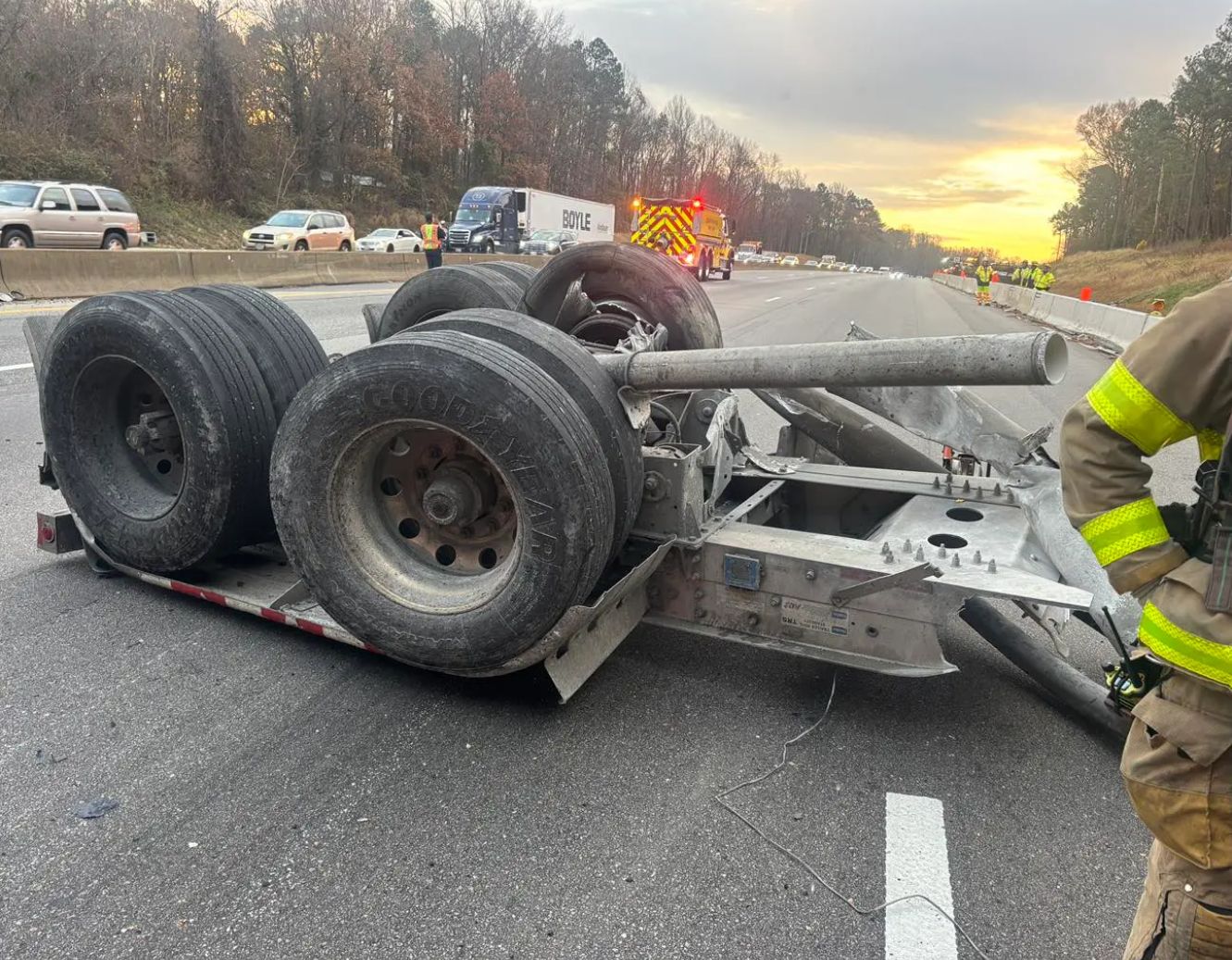 Tractor-trailer carrying lime overturns and catches fire on I-95 in Chesterfield County