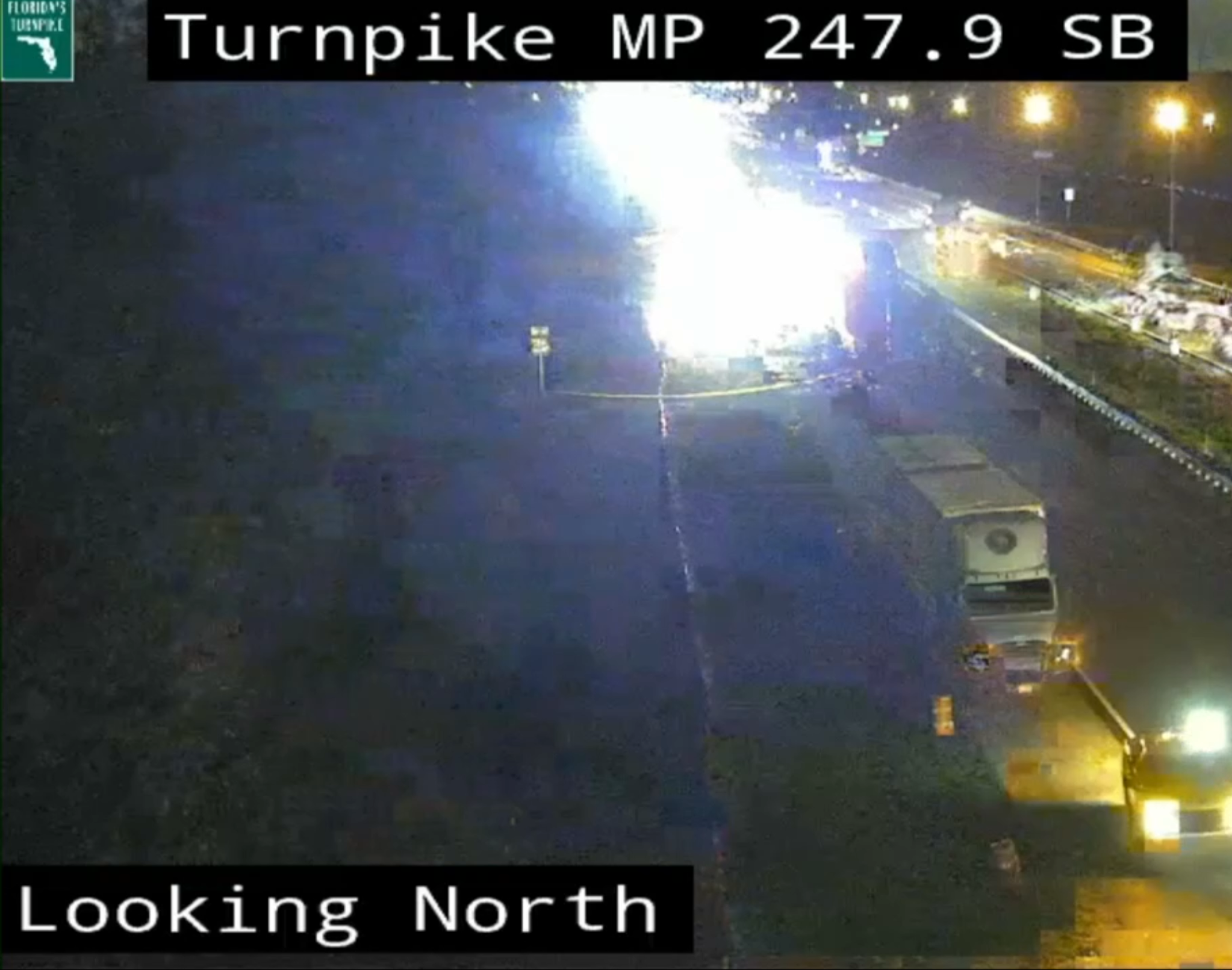 The severity of the crash forced troopers to close all southbound lanes from the time of the collision until about 2 p.m., directing all motorists off the Turnpike at Exit 249. At 2:20 p.m., FHP announced that the inside southbound lane had reopened, while the remaining lane would stay closed for extensive roadway repairs due to damage caused by the burning semi and debris.