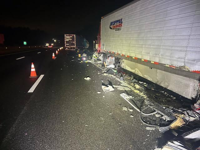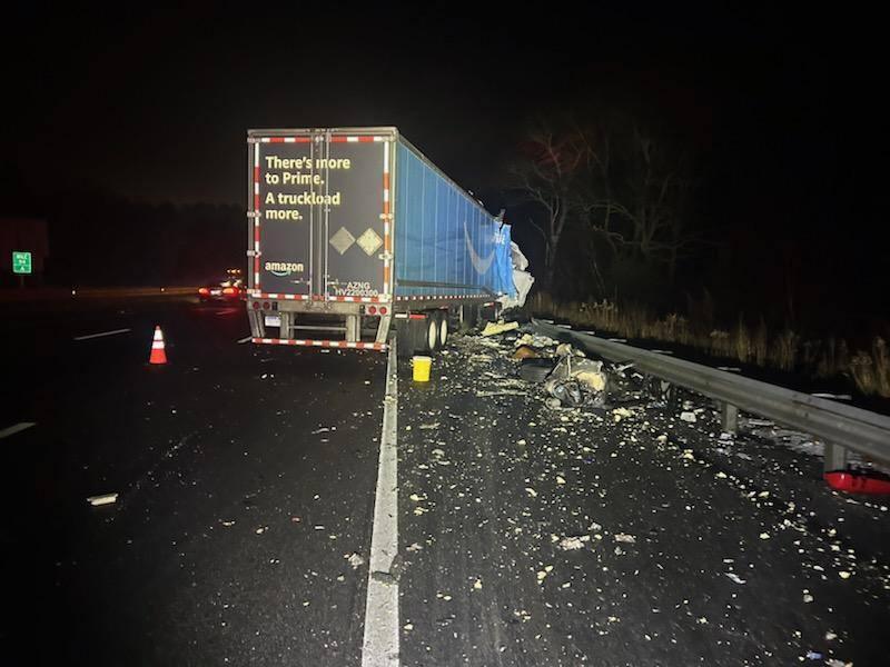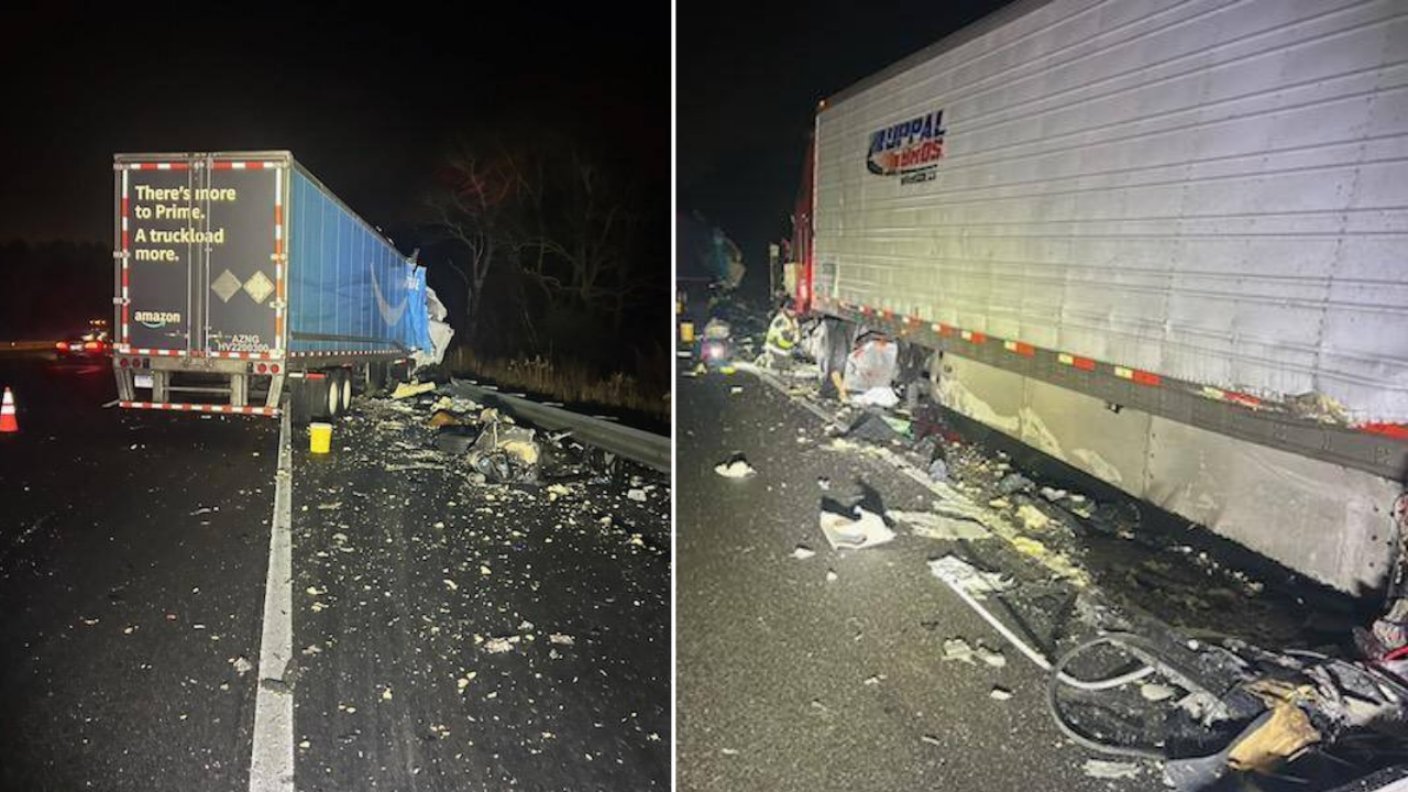 CHARLTON, Massachusetts — A crash involving two tractor-trailers shut down lanes on the Massachusetts Turnpike early Sunday morning, sending one person to the hospital and prompting an environmental response.