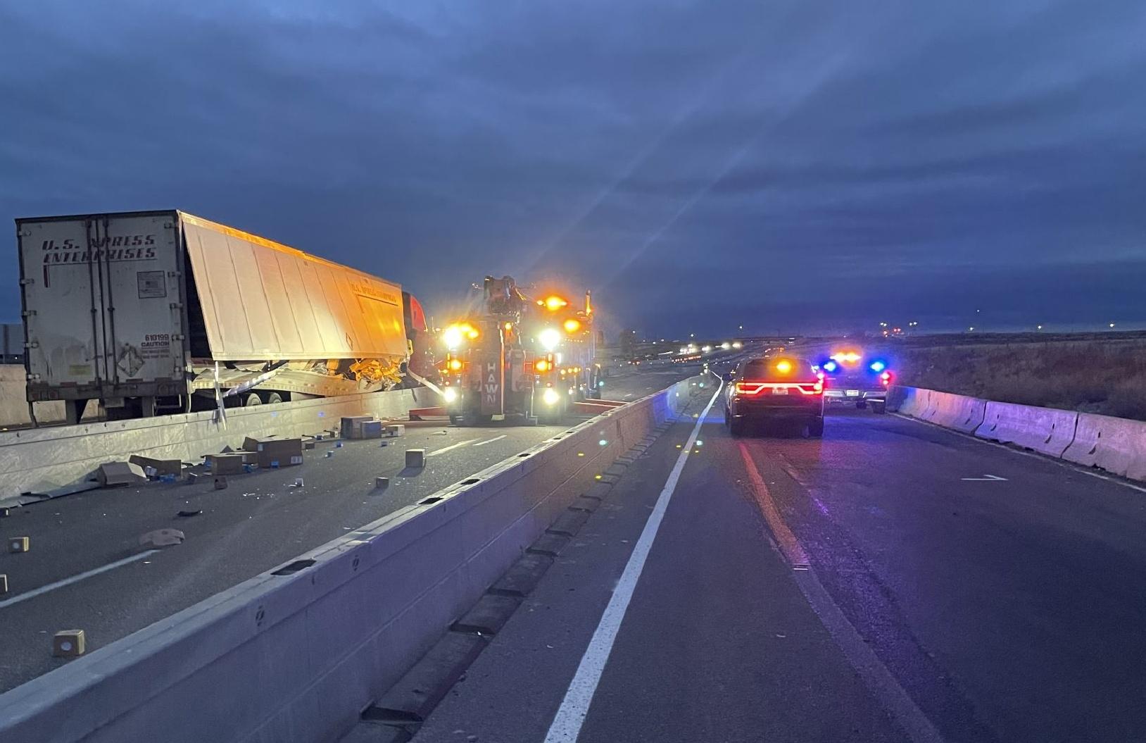 The crash occurred around 2:30 a.m. on northbound I-15 near milepost 73, where the semi struck the parked traffic control truck positioned for an active work zone. The impact tore open the trailer wall, spilled cargo across the roadway, and caused significant damage to the traffic control vehicle.