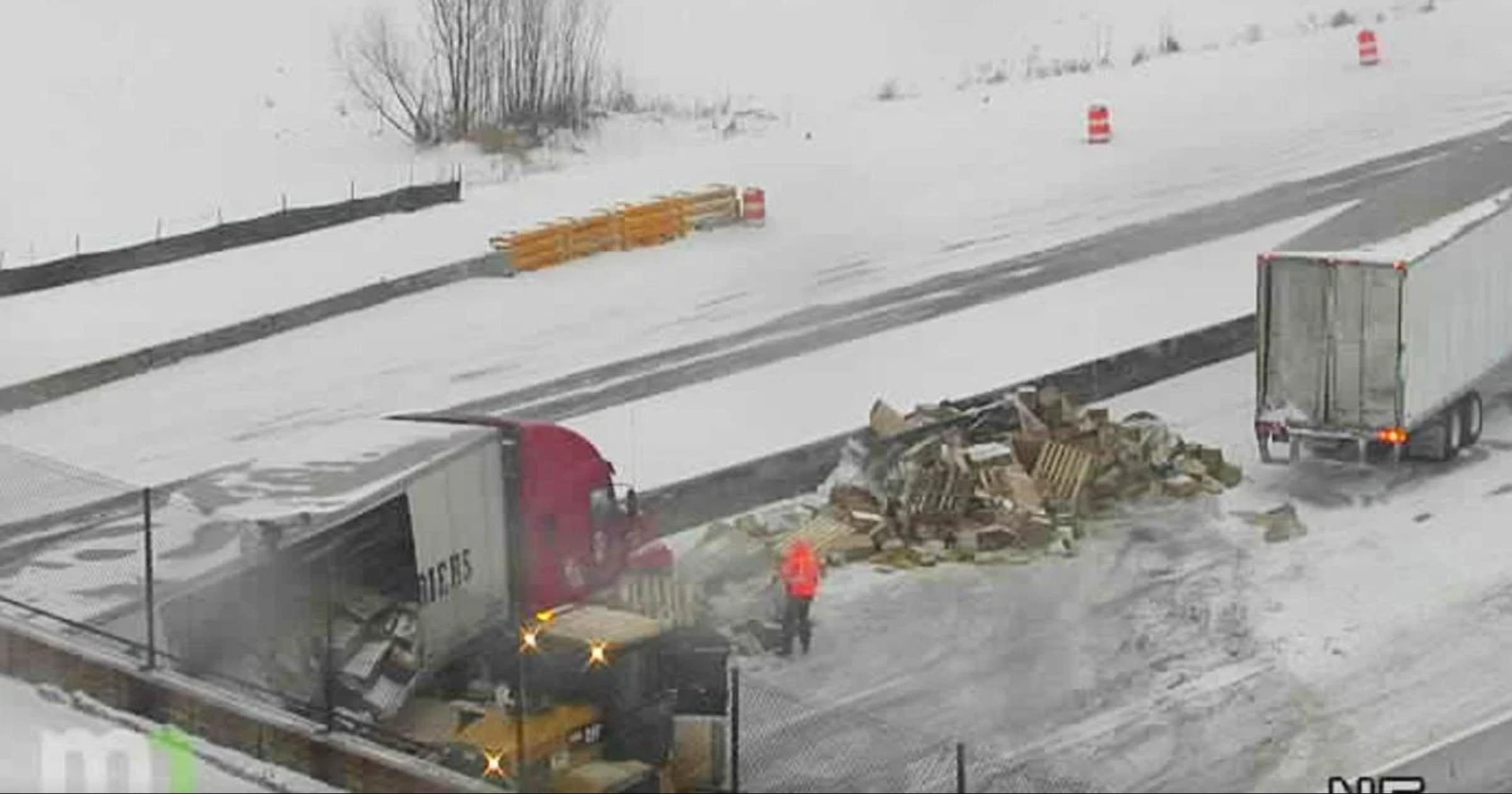 Semi-Trailer Crash Spills Wood Pallets Across I-94 During Minnesota Snowstorm