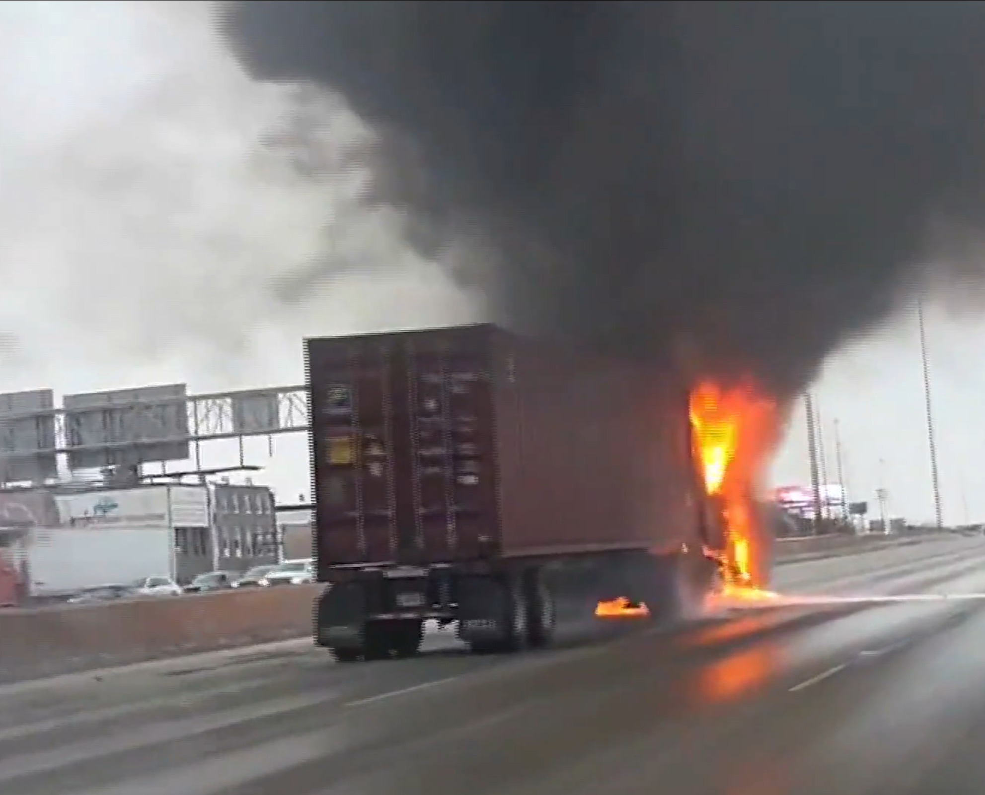 The incident began around 3:10 p.m., when troopers responded to reports of a semi-truck fully engulfed in flames in the middle of the expressway. Cellphone and social media video captured the dramatic scene, showing the cab burning intensely and a towering plume of black smoke rising across Chicago’s Southwest Side.