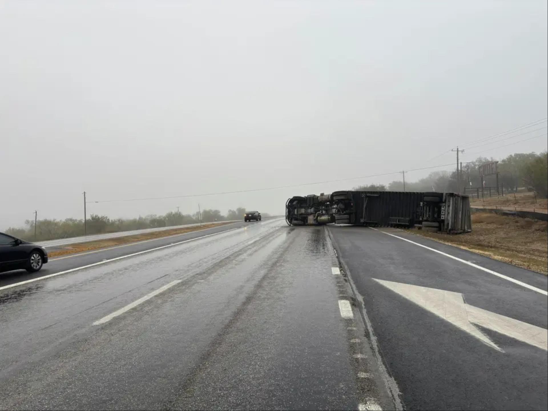 Semi-Truck Flips in Dense Fog and Slick Conditions on Highway 90 Near San Antonio