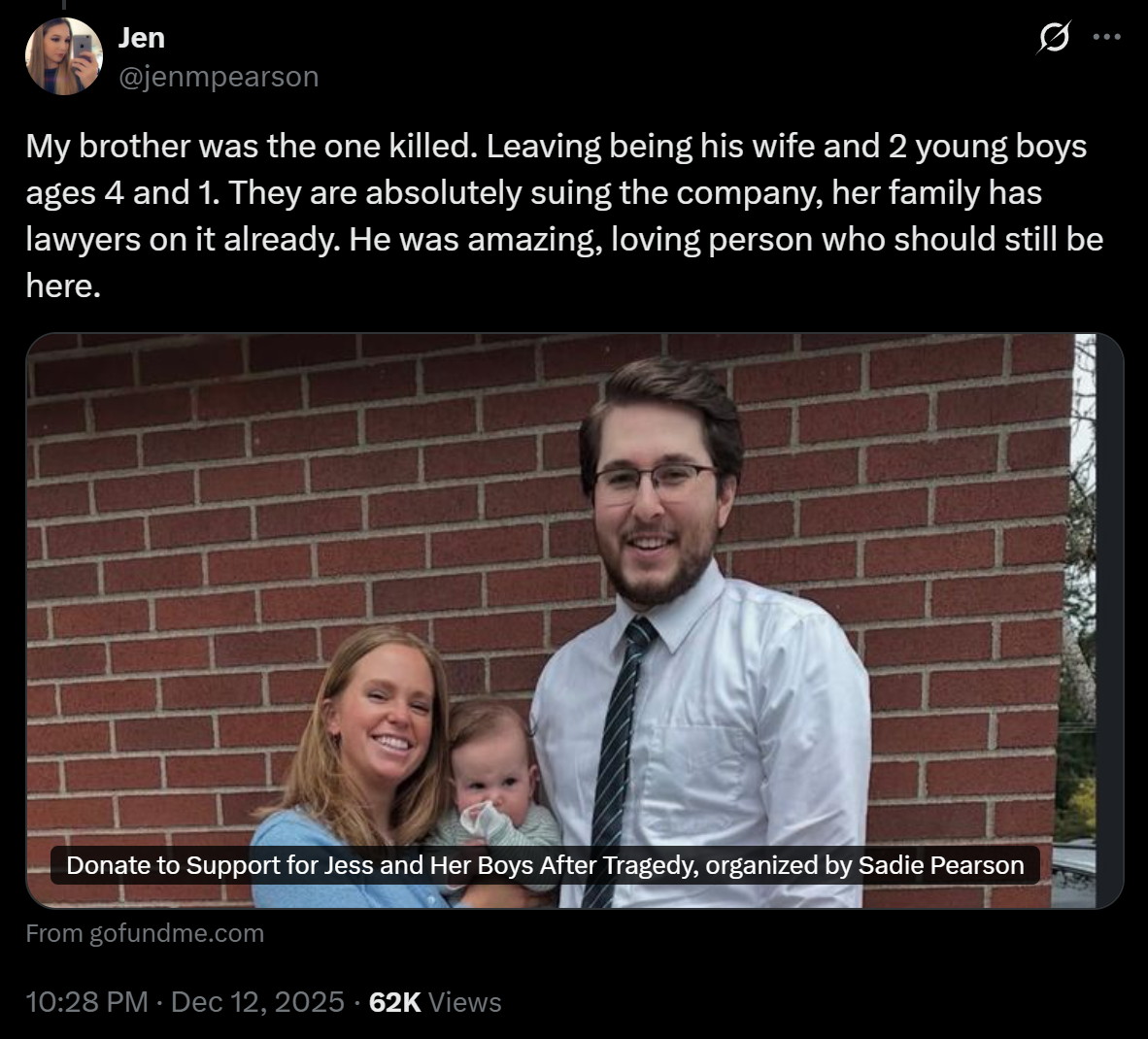 “My brother was the one killed. Leaving behind his wife and two young boys ages 4 and 1. They are absolutely suing the company… He was an amazing, loving person who should still be here.”