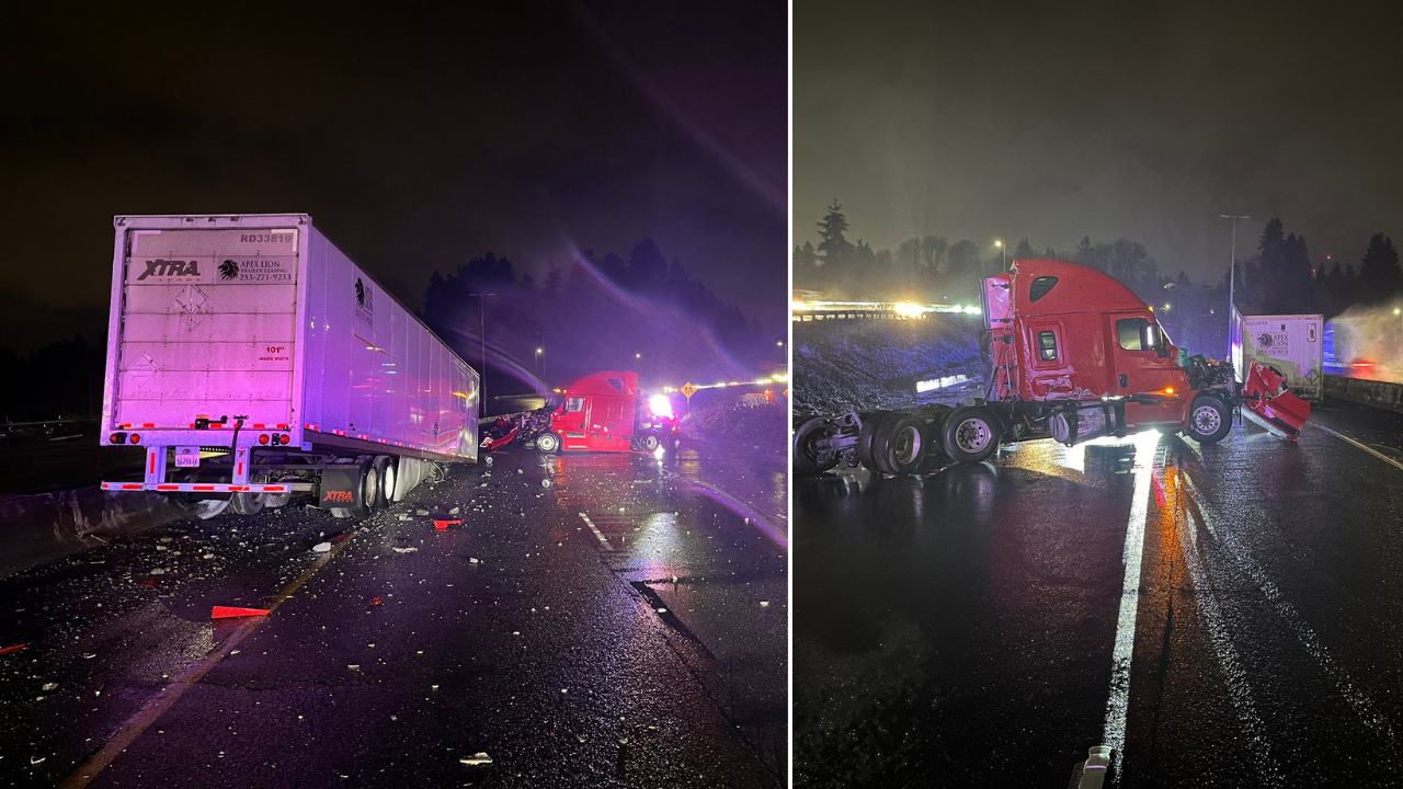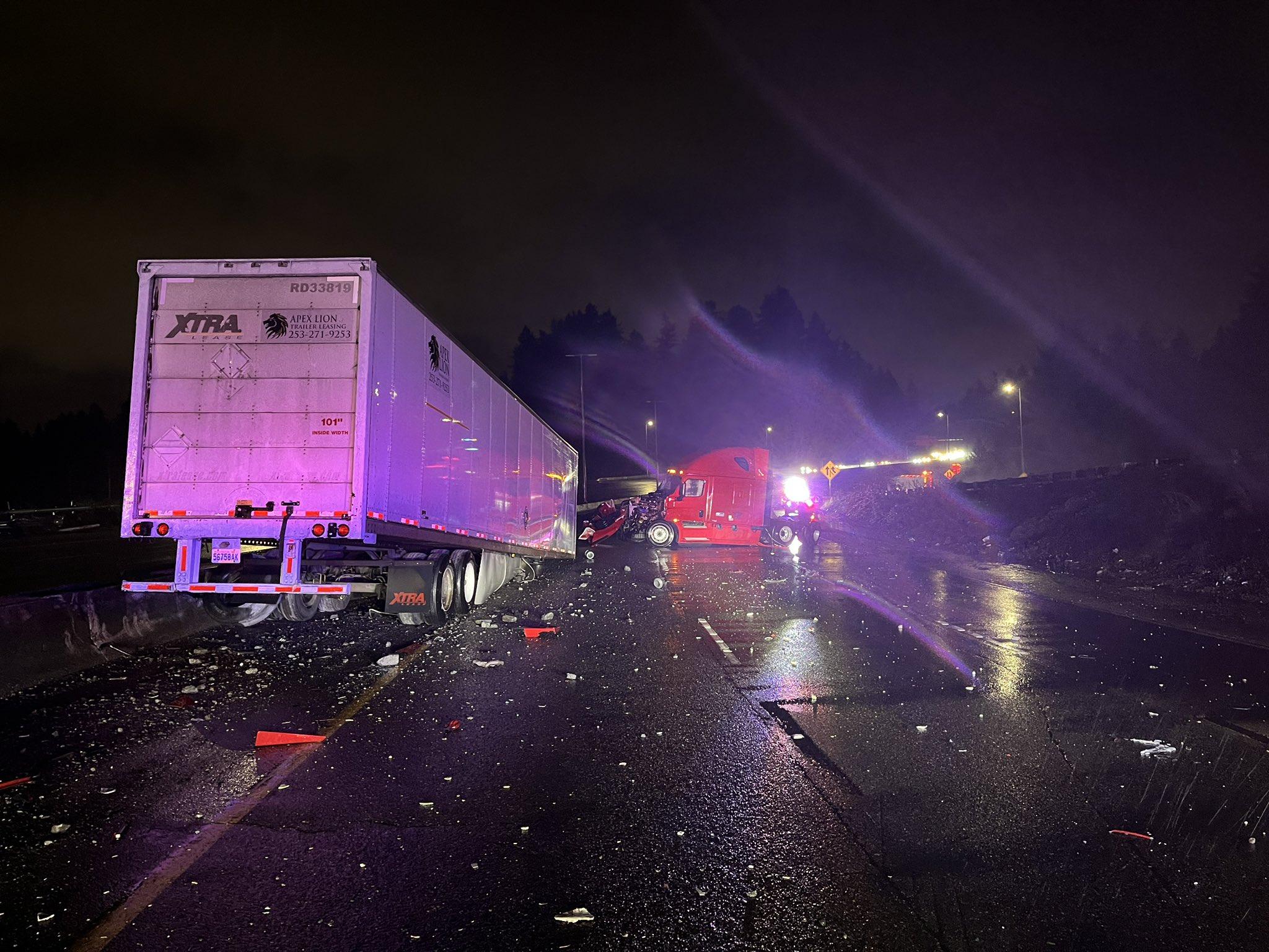 OLYMPIA, Washington — A major early-morning crash involving three semi-trucks and a passenger car shut down all northbound lanes of Interstate 5 near U.S. 101 on Monday, according to the Washington State Patrol.