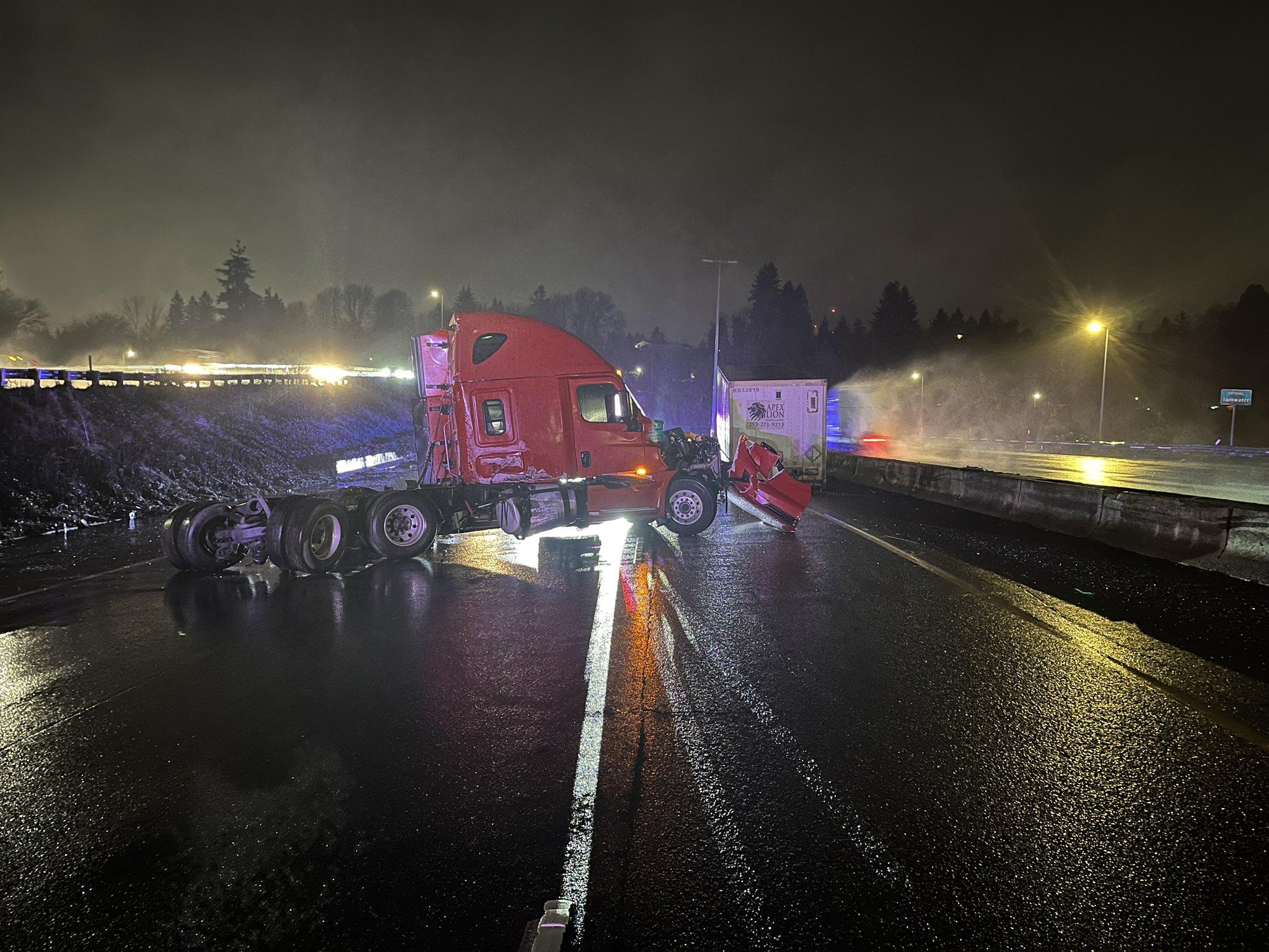 was diverted onto Deschutes Parkway S.W. while WSDOT crews and emergency responders worked to clear the wreckage and repair the damaged concrete barrier. WSP, WSDOT Tacoma, Incident Response Team units, commercial vehicle enforcement, and fire crews all responded to the scene.