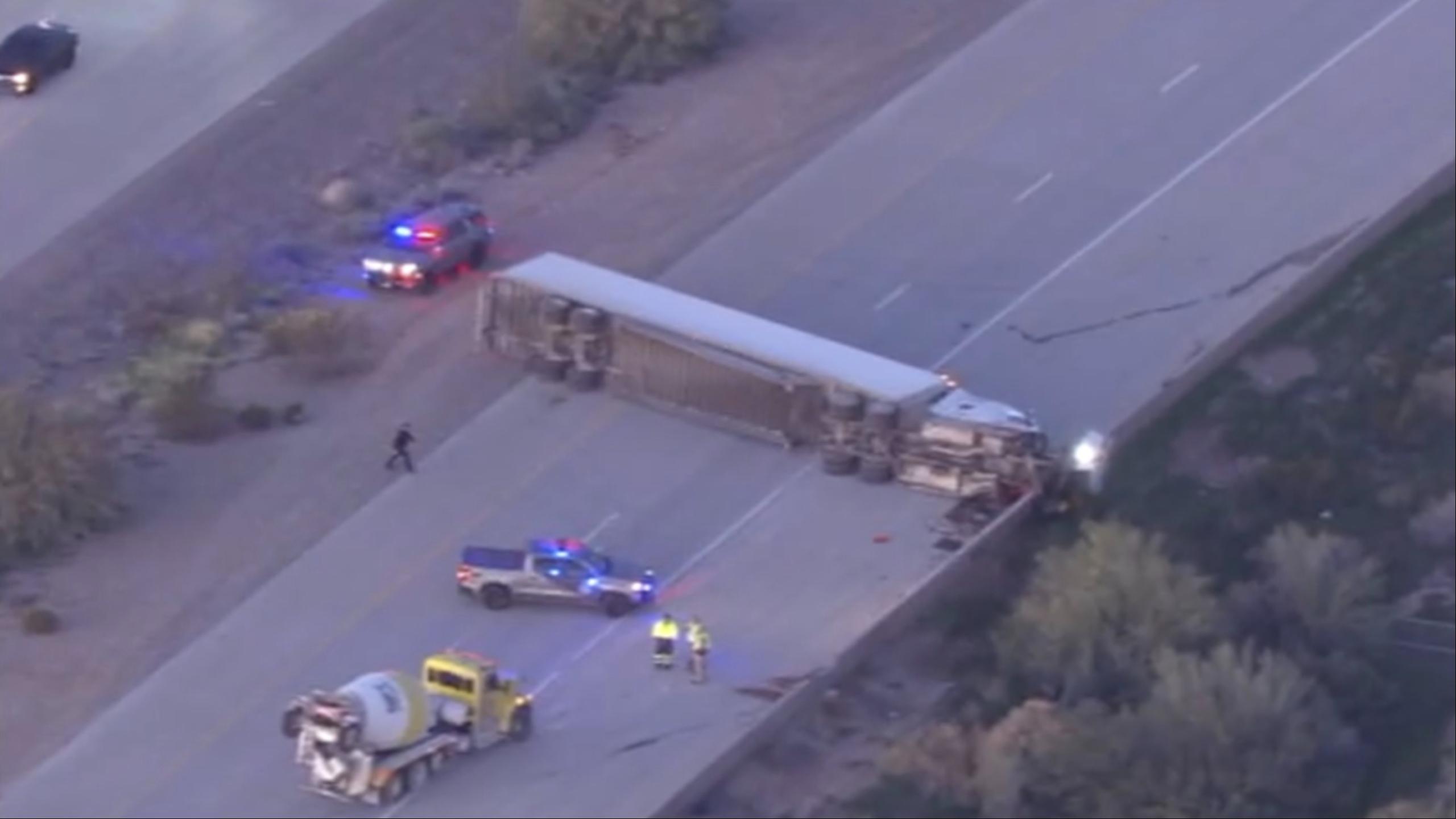 The crash happened around 5:30 a.m. near Lake Pleasant Parkway, where a commercial truck pulling a trailer overturned, coming to rest on its side and blocking the entire roadway. DPS confirmed that two people were inside the truck, and one person was killed in the rollover.