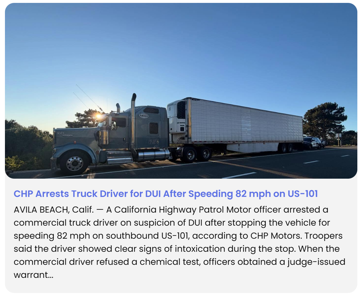 SAN LUIS OBISPO COUNTY, California — A semi-truck driver was arrested on Highway 101 near Avila Beach after a traffic stop for speeding led to the discovery of an alleged third DUI offense, along with the use of false identification to conceal a lifetime commercial license suspension, authorities said.