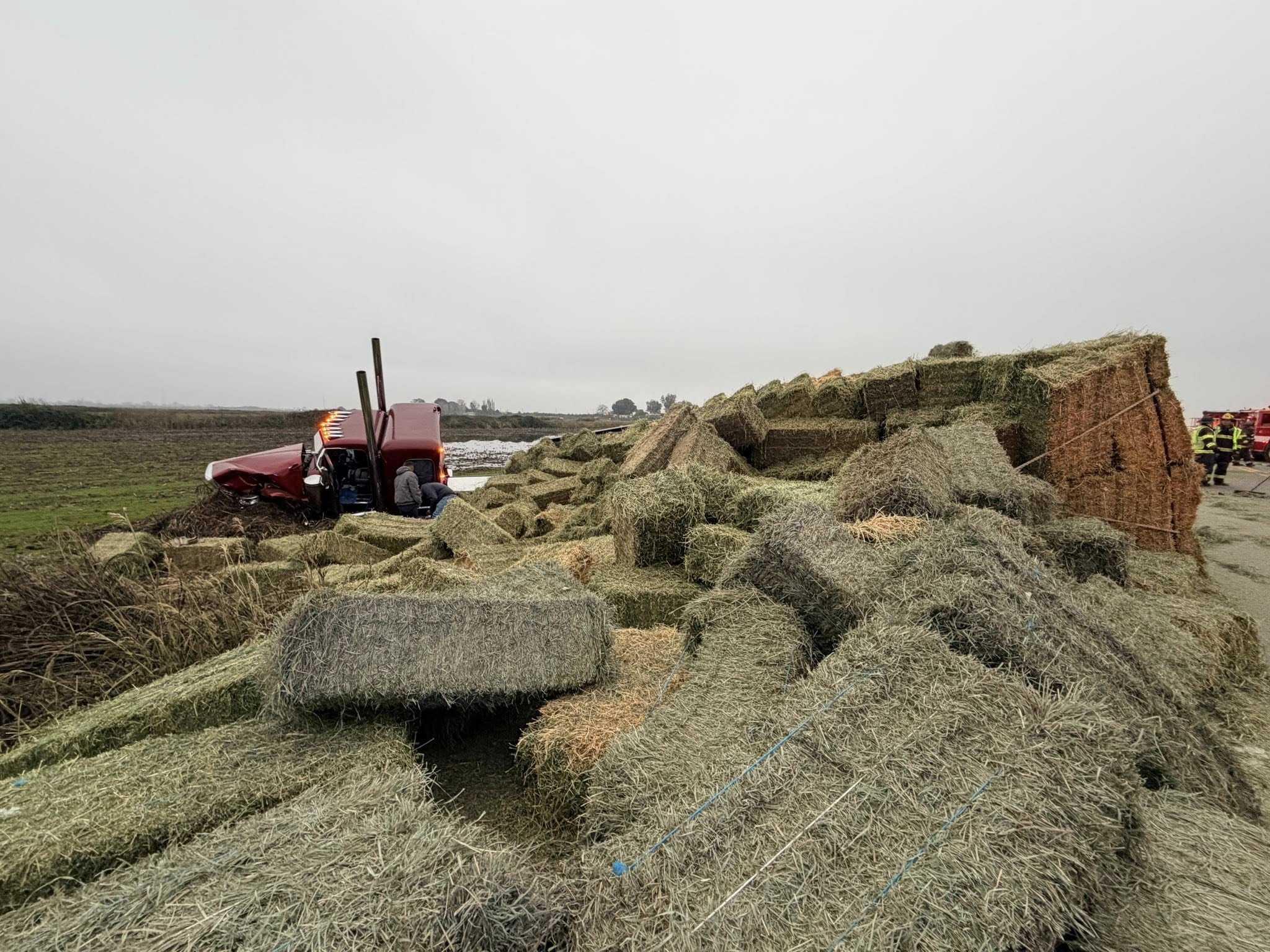 Photos released by the River Delta Fire District showed the semi-truck with heavy front-end damage, overturned off the roadway, with bales of hay scattered near the crash site.