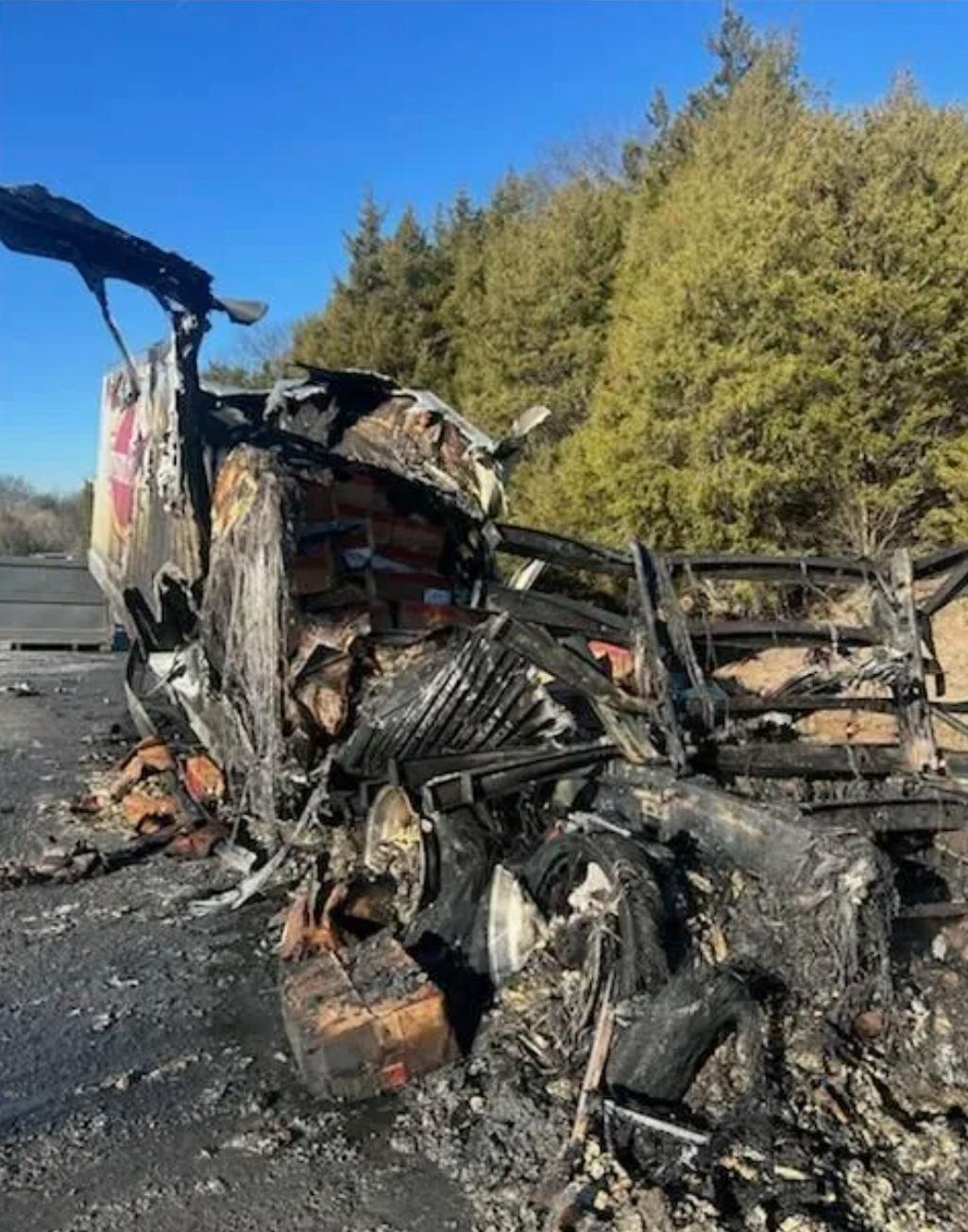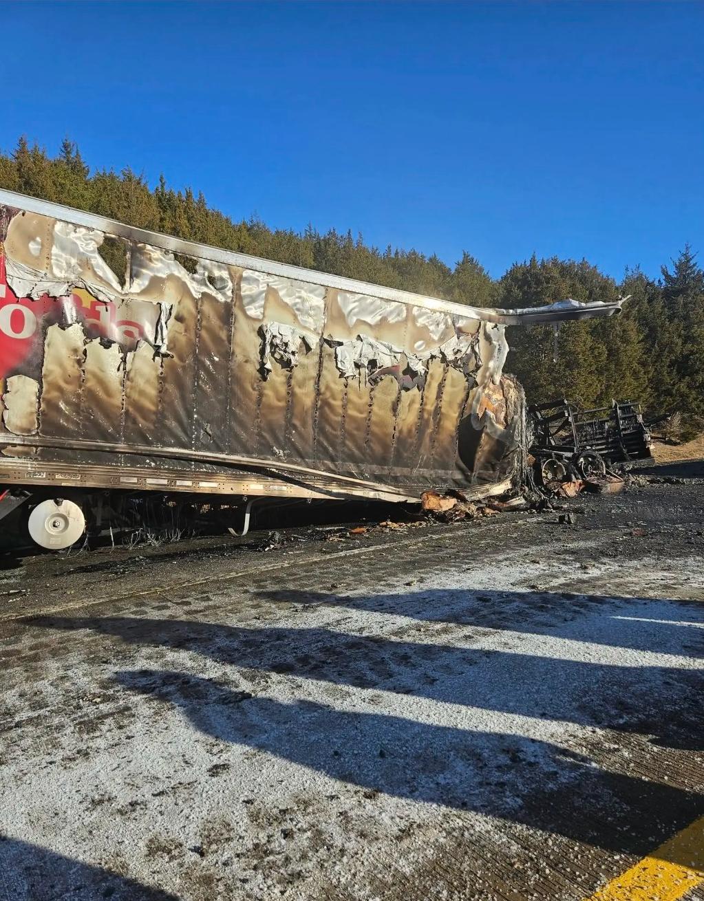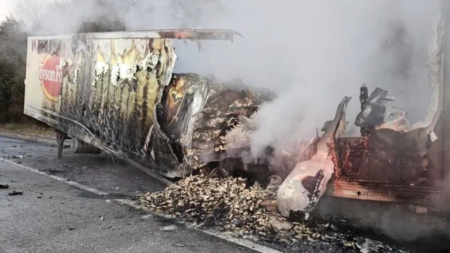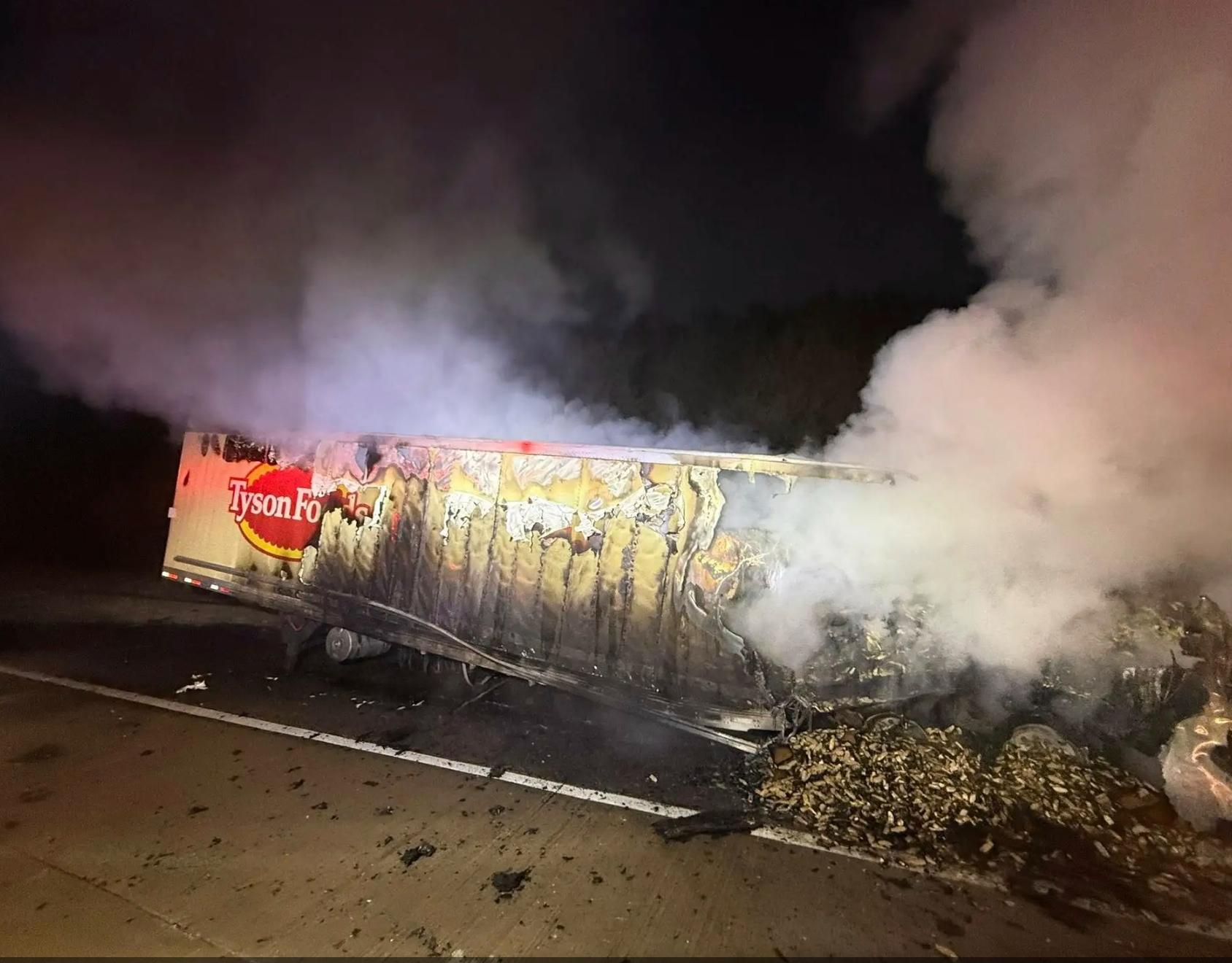 HAMBLEN COUNTY, TENNESSEE — A tractor-trailer carrying chicken tenders caught fire on Interstate 81 in Hamblen County Tuesday morning after an axle caught fire, leaving the load charred while firefighters worked in below-freezing conditions. No injuries were reported.