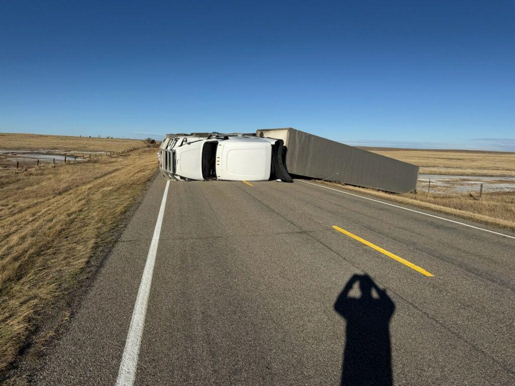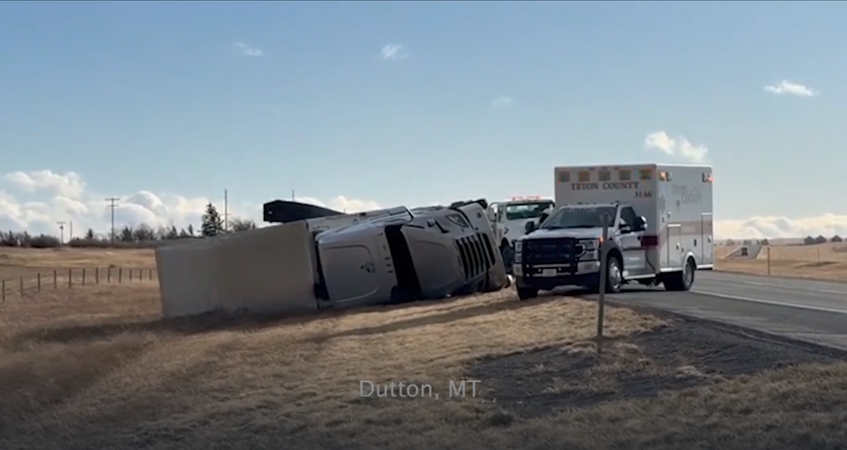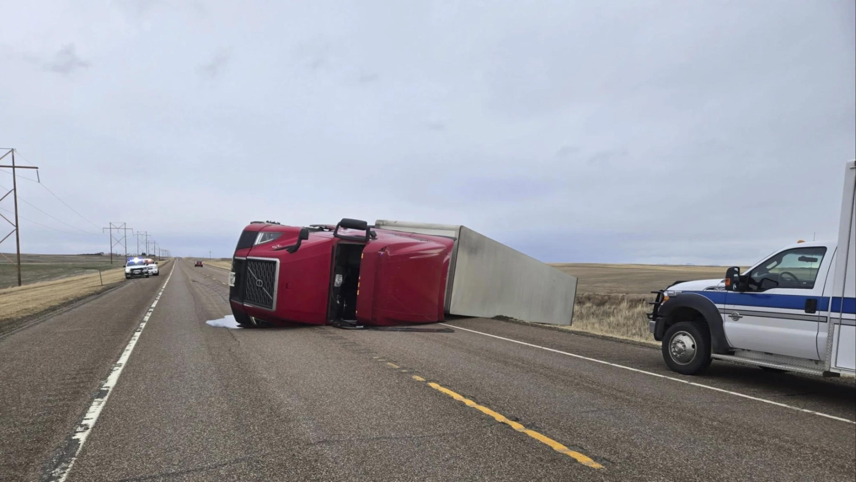 The Chouteau County Sheriff’s Office posted: “Semi truck blown over by crosswinds and blocking highway at mile marker 26 on MT80. Detour on county roads in place. High profile vehicles should avoid this area.”