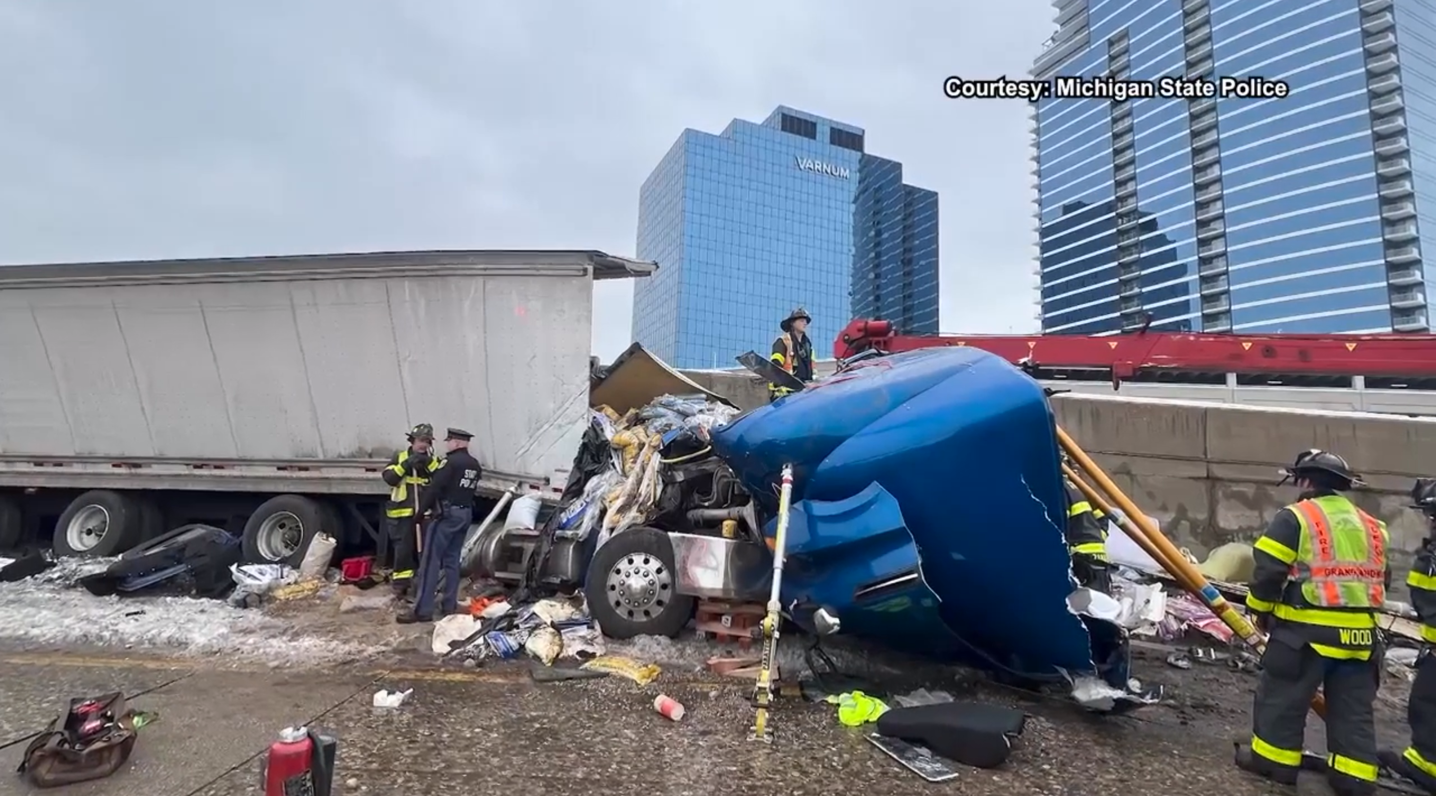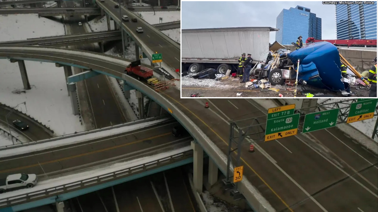 Police said a semi-truck hauling about 140,000 pounds of pea gravel and sand was traveling south in the center lanes of U.S. 131 when the front end began to veer left. Police said the driver tried to straighten the truck but drifted into the ramp coming from I-196 westbound. The truck flipped, hit a concrete wall, and became partially wedged under the ramp, police said. After the crash, the ramp onto southbound U.S. 131 from westbound I-196 was closed “indefinitely,” authorities said at the time.