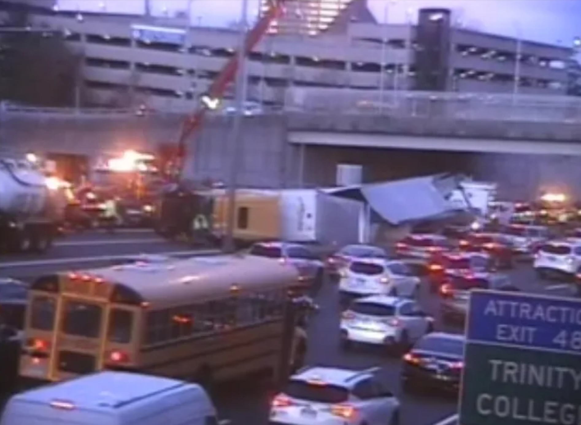 HARTFORD, CONNECTICUT — An overturned tractor-trailer crash on Interstate 84 East in Hartford shut down multiple lanes Monday morning and prompted an environmental response for a fuel leak, while a separate crash on Interstate 84 West later caused additional lane closures, officials said.