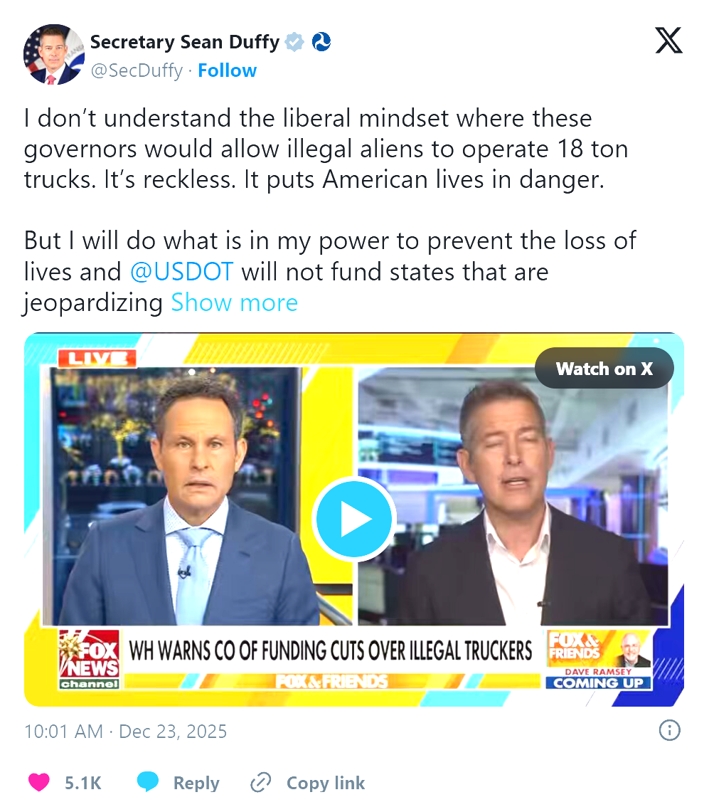 Speaking Tuesday on “Fox & Friends,” Duffy said his department has been working to improve highway safety ahead of the holiday travel surge. He alleged that “CDL mills” are enabling fraudulent sign-offs and allowing some people to obtain licenses without proper training. Duffy also said drivers who cannot meet requirements such as English proficiency and federally required training should not be operating commercial trucks, describing the risks associated with heavy trucks on public roads.