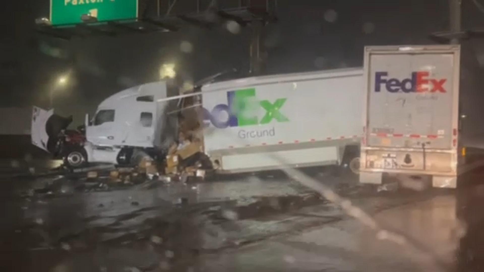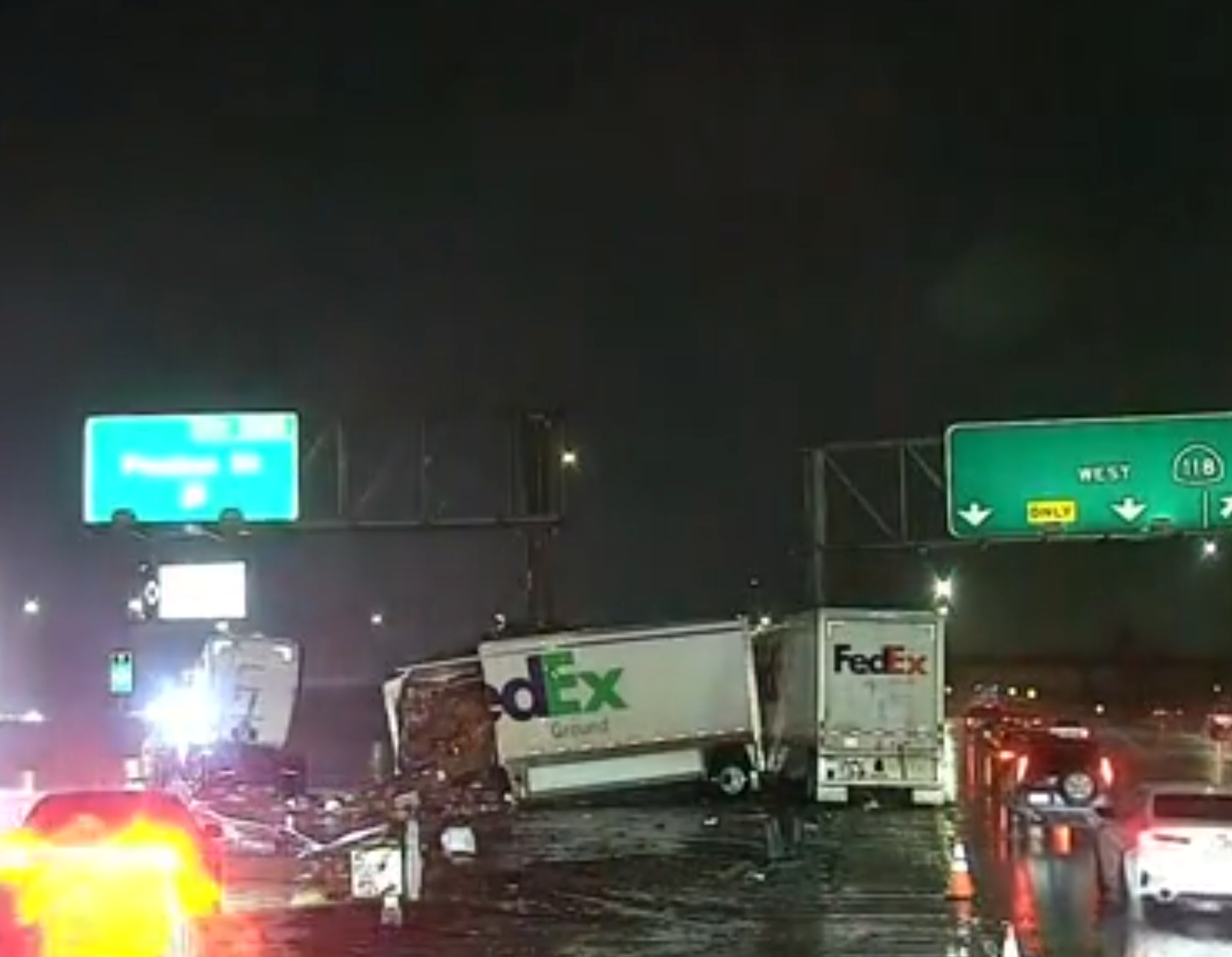 PACOIMA, CALIFORNIA — A crash involving two FedEx big rigs scattered packages and shut down all lanes of northbound Interstate 5 in the San Fernando Valley early Wednesday, causing major delays across multiple freeways as crews worked to clear the damaged trucks.
