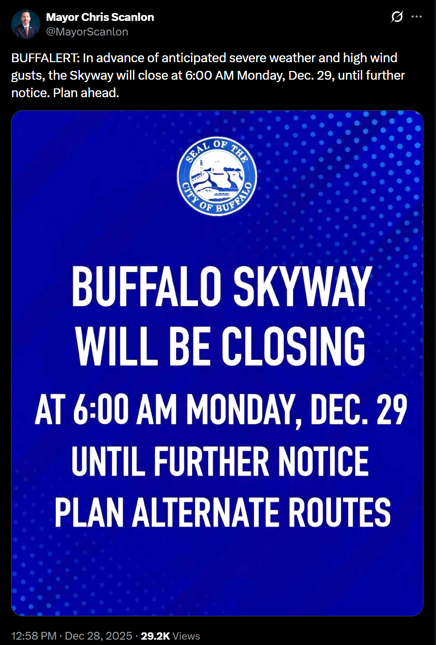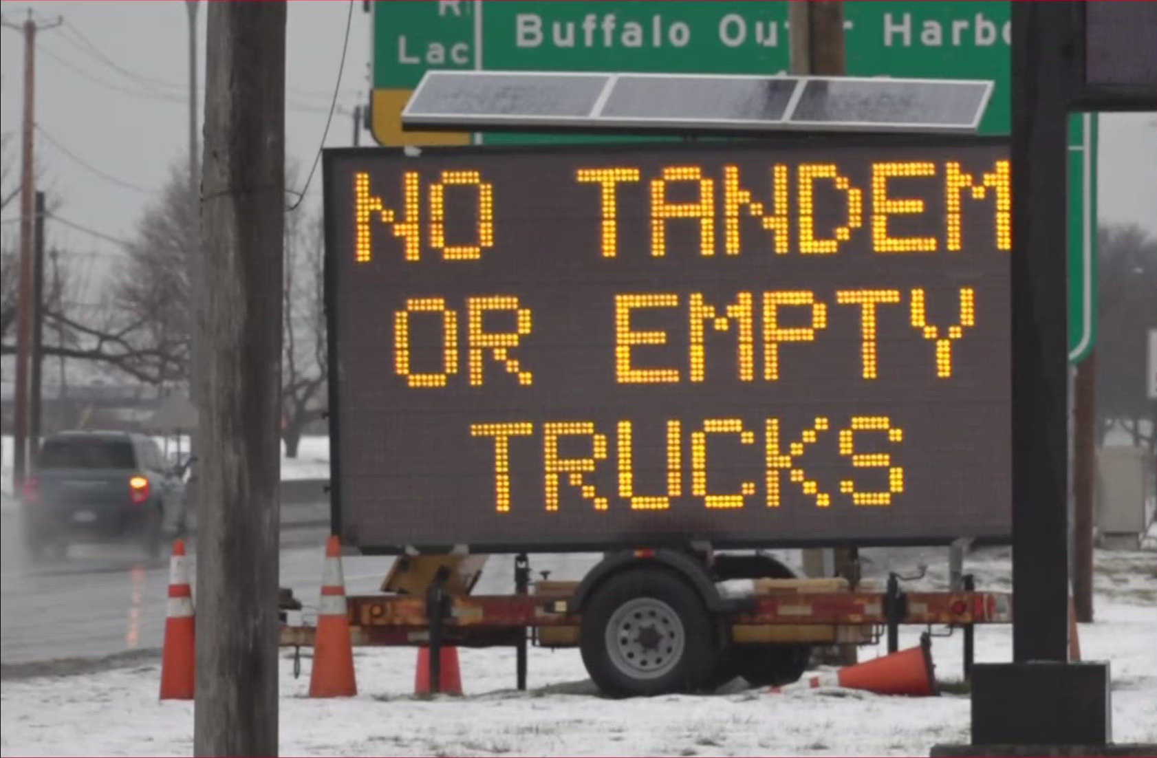 Officials first announced the Buffalo Skyway would be closed starting at 6:00 a.m. Monday due to severe weather moving through the region, including strong winds and snow. Later Sunday evening, Governor Kathy Hochul announced that an empty tractor-trailer and tandem ban would go into effect at 6:00 a.m. Monday on the following roadways in Western New York: