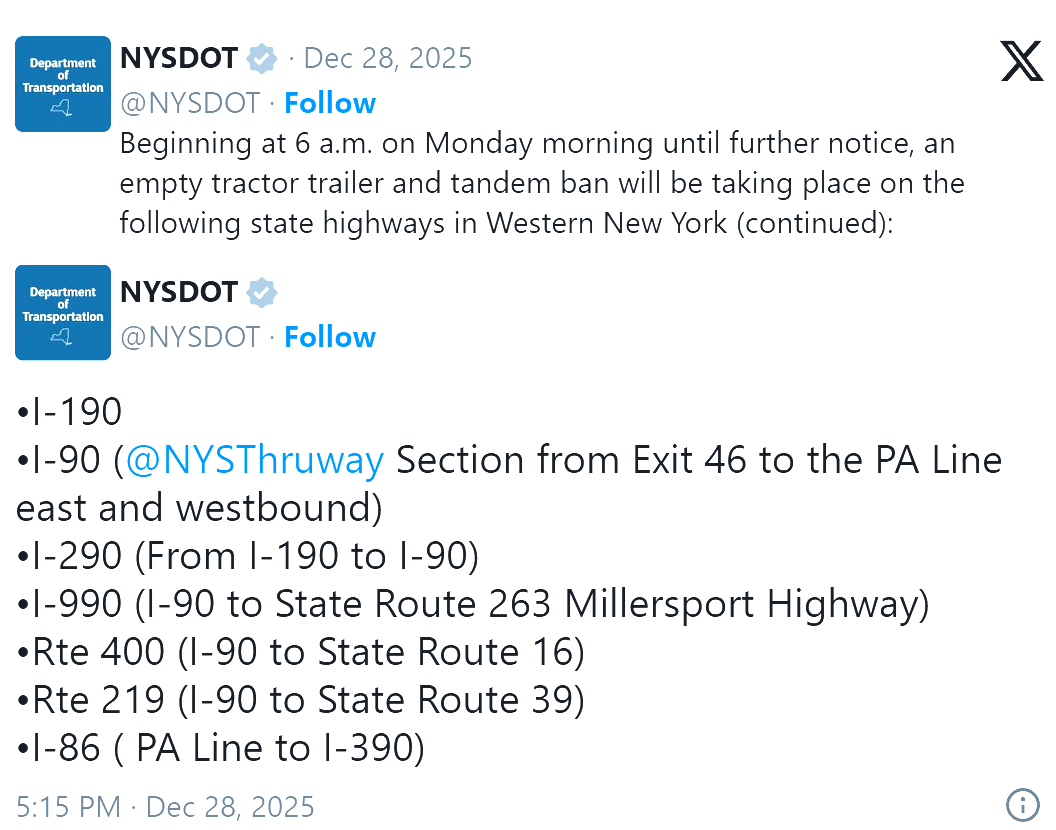 The empty tractor-trailer and tandem ban was stated to be in effect Monday until further notice across the listed roadways, including the New York State Thruway from Exit 46 in Henrietta to the Pennsylvania border, as well as I-190 and I-290, as storm response operations continue.