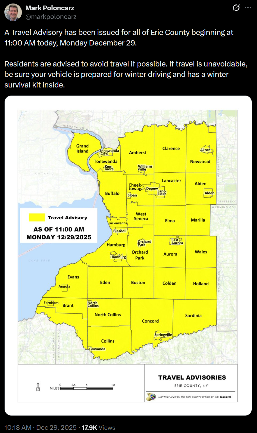 A Travel Advisory was issued for all of Erie County beginning at 11:00 a.m. Monday, December 29. A separate travel advisory was also noted for the City of North Tonawanda lasting Monday until 12:00 a.m. Tuesday, with Mayor Austin Tylec emphasizing it is not a travel ban but urging residents to treat it as a precaution for safety.