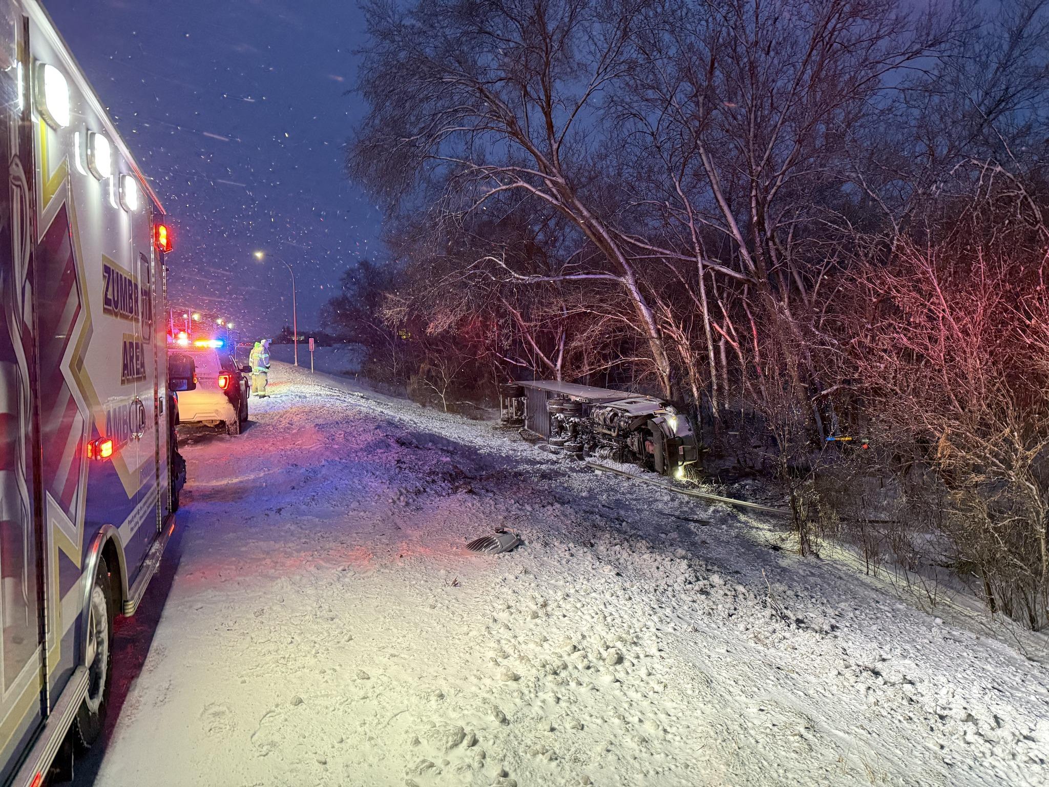 PINE ISLAND, MINNESOTA — A semi-truck driver was injured and taken to the hospital after a tractor-trailer left the roadway near Pine Island early Monday morning and rolled down an embankment, as responders warned that roads in the area remained extremely slick and travel should be avoided unless necessary.