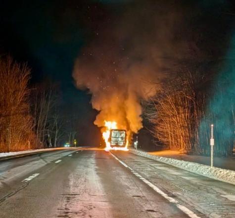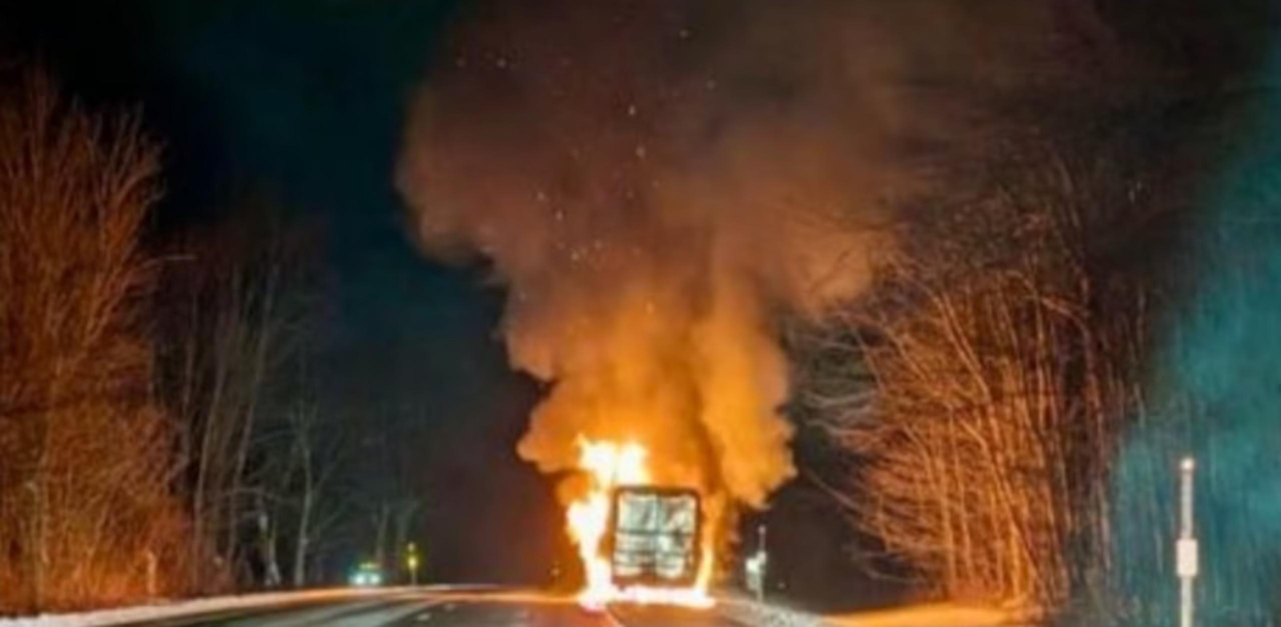 A preliminary investigation determined that a 2016 Kenworth tractor towing a trailer hauling frozen vegetables was traveling southbound when the operator, Oussama Jaziri, a 40-year-old man from Canada, heard a loud noise coming from the vehicle. Police said the driver pulled over to the west shoulder to investigate and observed an axle on the trailer glowing red. Shortly afterward, a fire ignited and the tractor became fully engulfed in flames, police said.