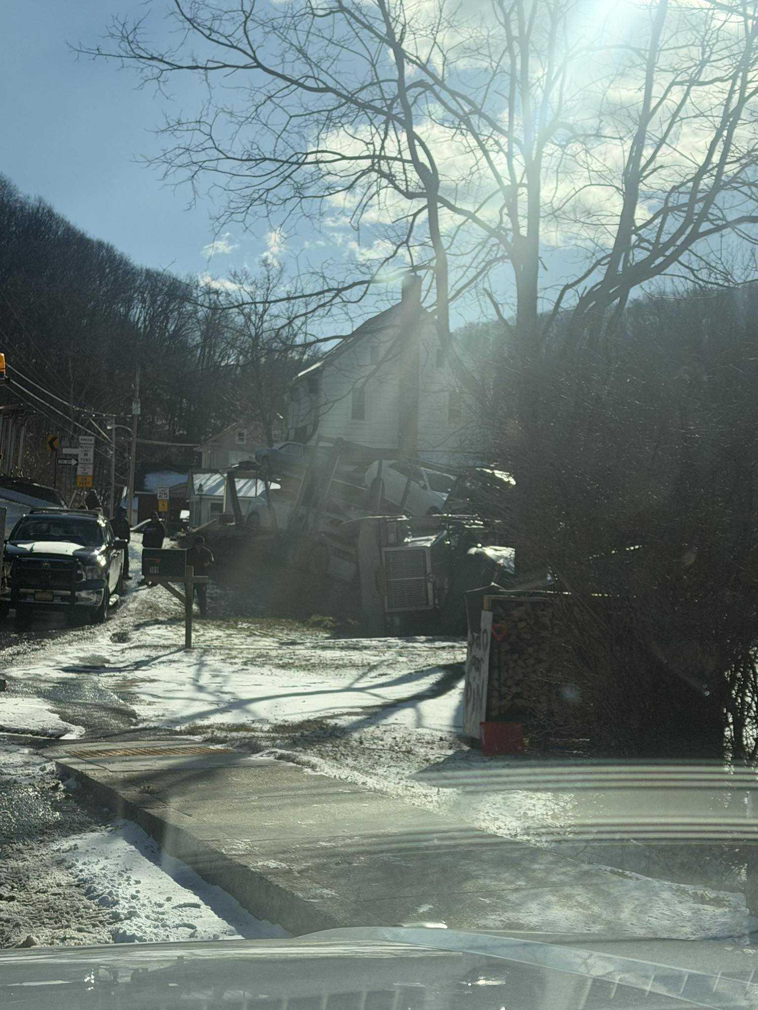 FELTON BOROUGH, PENNSYLVANIA — A tractor-trailer hauling cars rolled over at a Felton Borough intersection Thursday morning, flipping into a home and spilling multiple vehicles off the trailer into a yard, shutting down Main Street near Beaver Street for hours as crews worked to clear the wreckage, officials said.