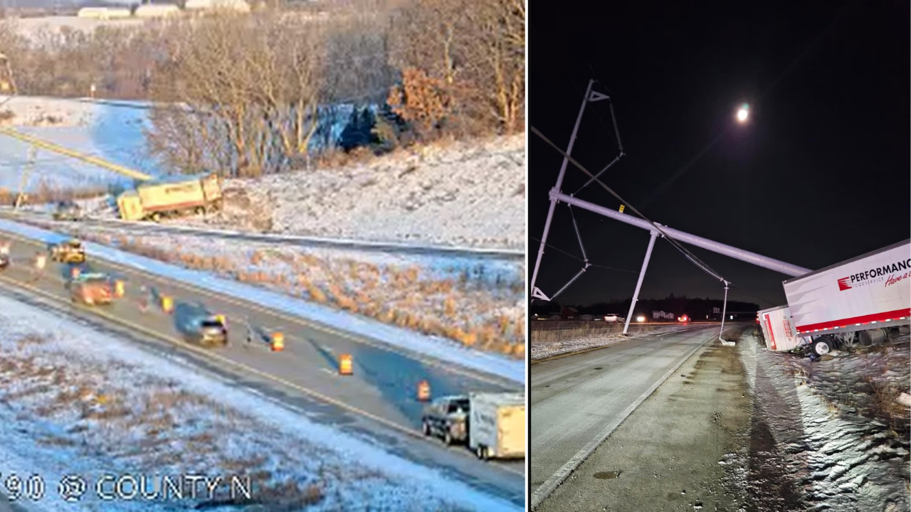 MCFARLAND, WISCONSIN — A semi-truck hauling food products crashed into a high-voltage power pole early Friday morning near McFarland, bringing the pole down onto the cab and trapping the driver inside, prompting lane and ramp closures on Interstate 39/90 that authorities said could remain in place into the weekend.