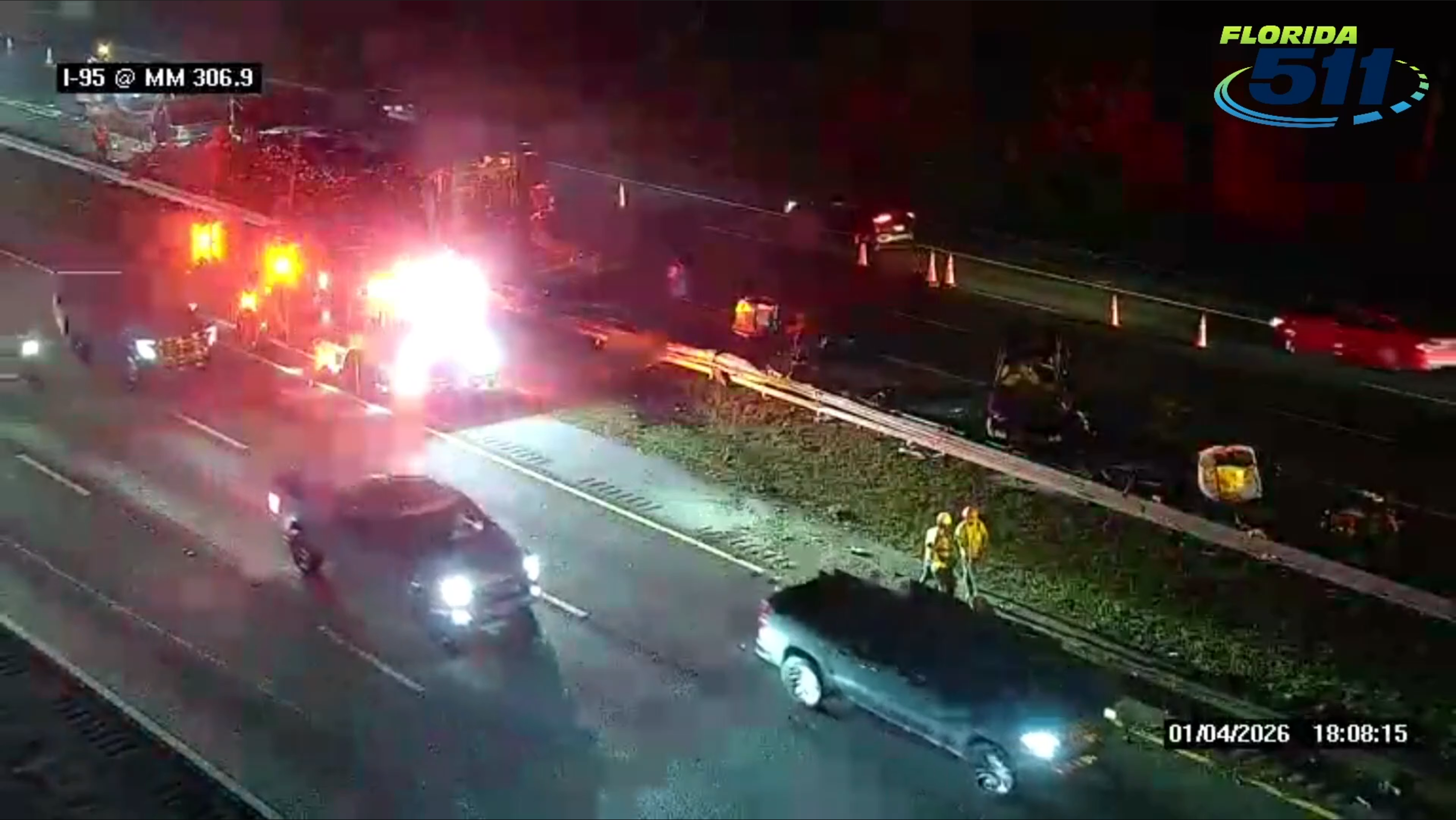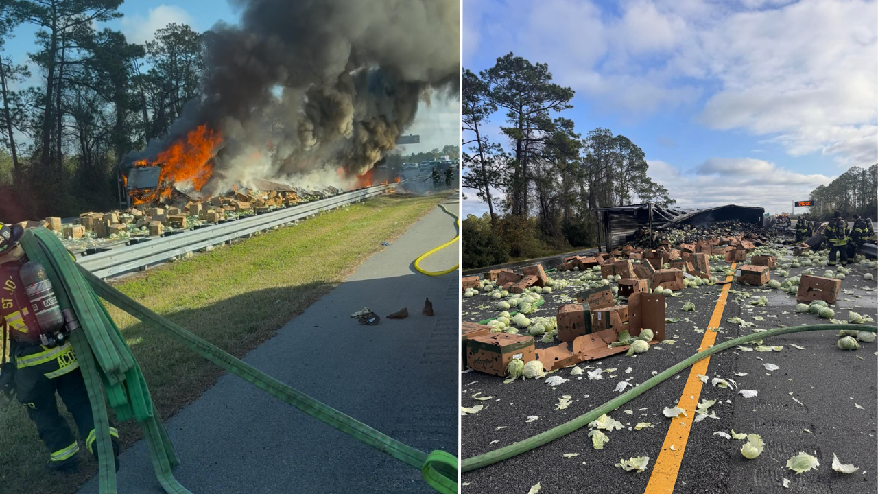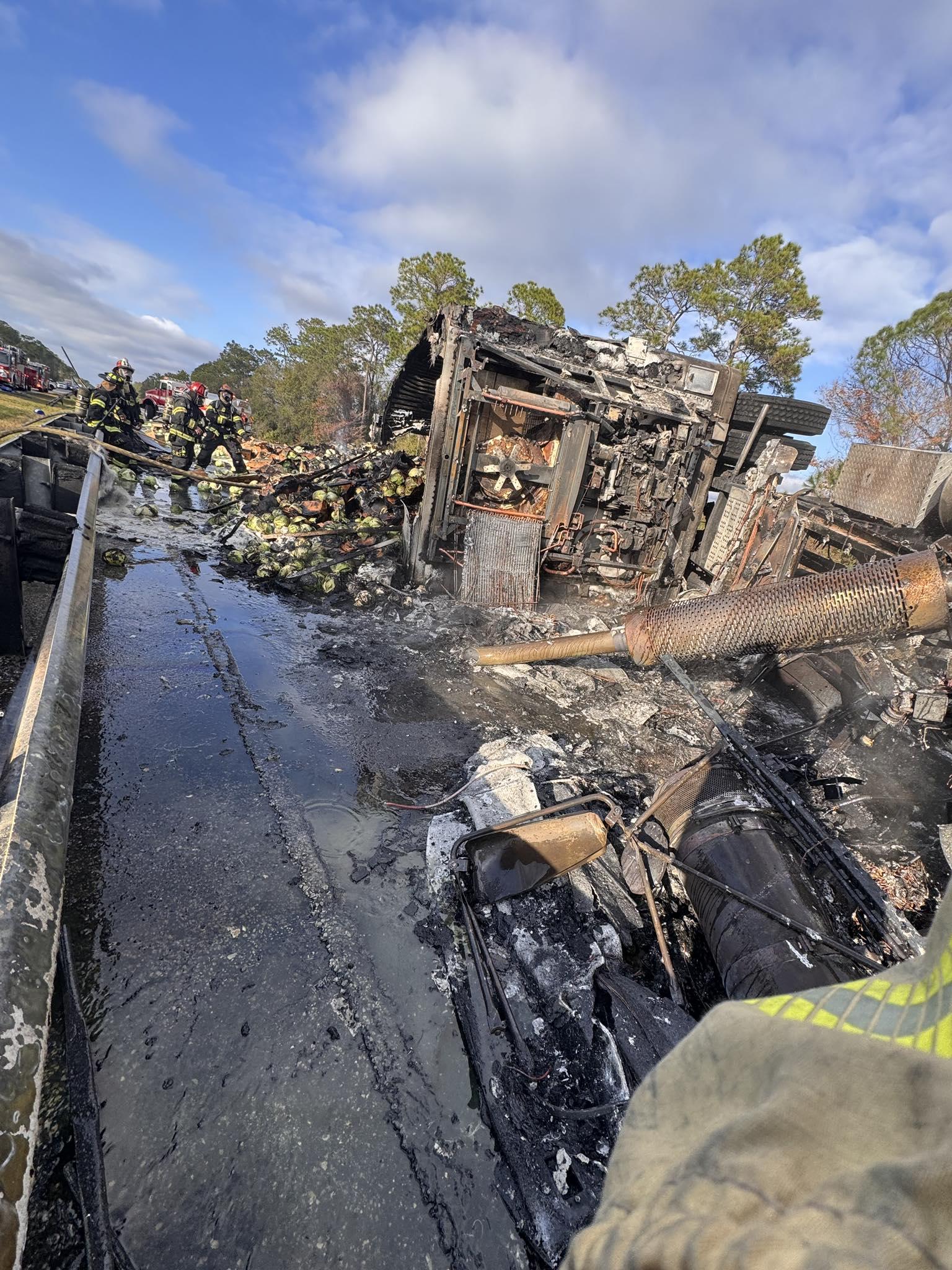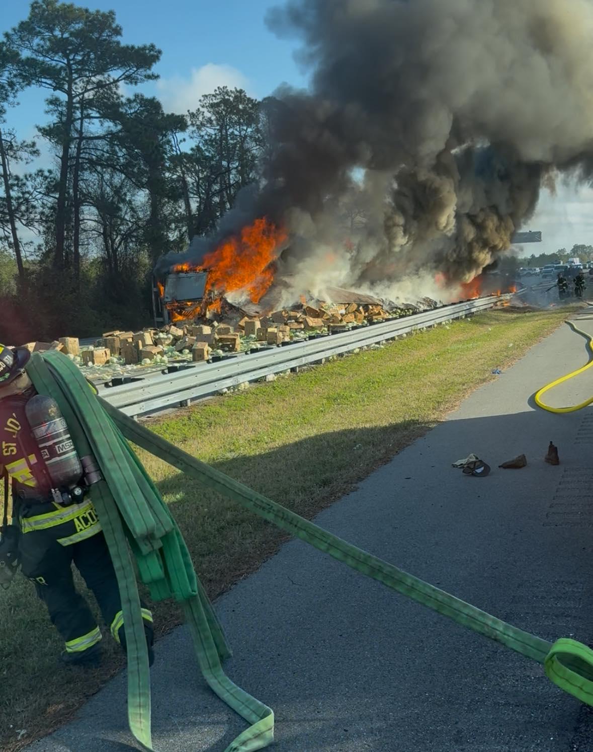 ST. JOHNS COUNTY, FLORIDA — A major crash involving a cabbage-hauling semi-truck triggered a large fire and heavy damage to a second vehicle on I-95 northbound at mile marker 307, between State Road 206 and State Road 207, forcing officials to shut down both northbound and southbound lanes as emergency crews responded.