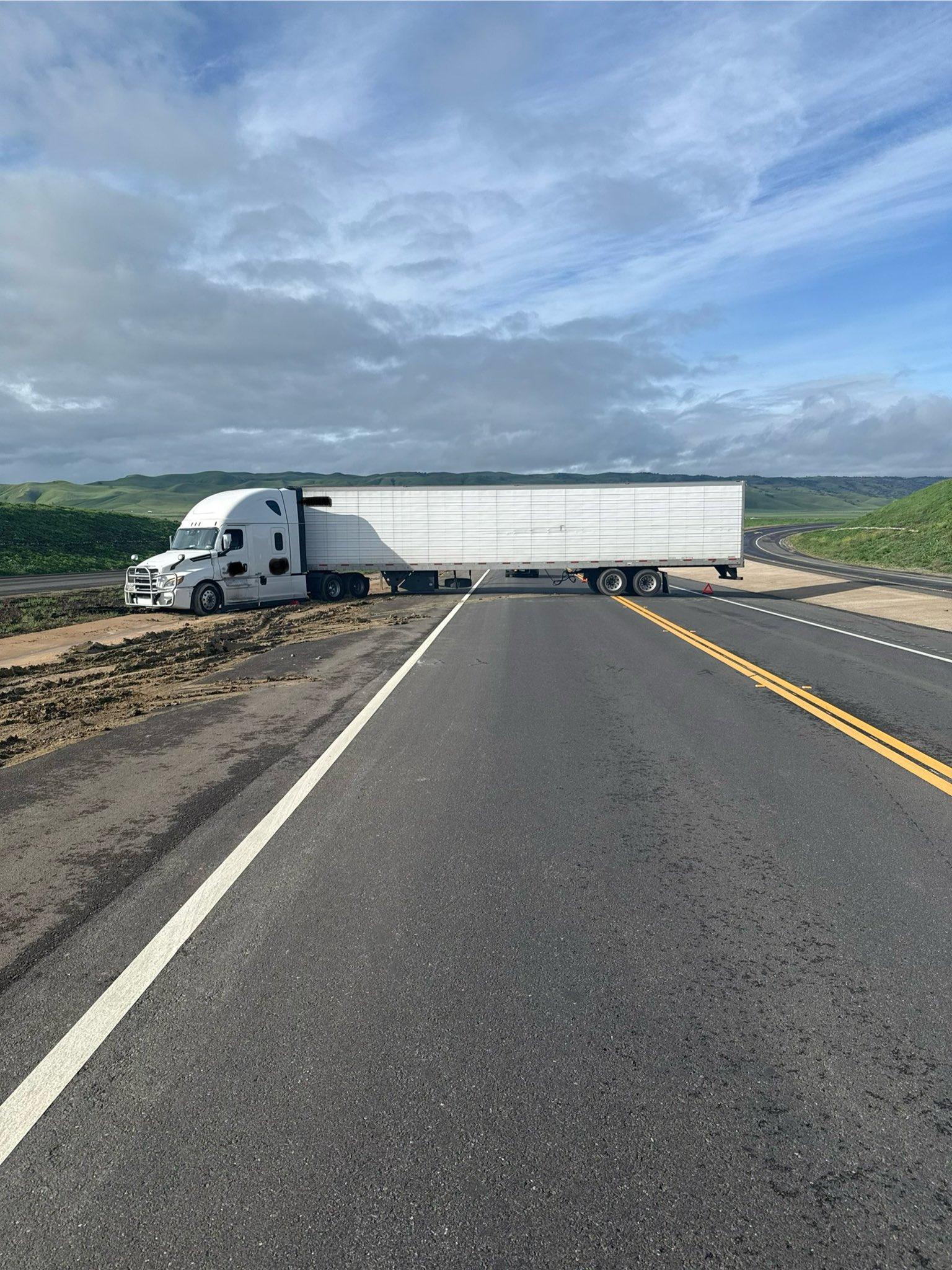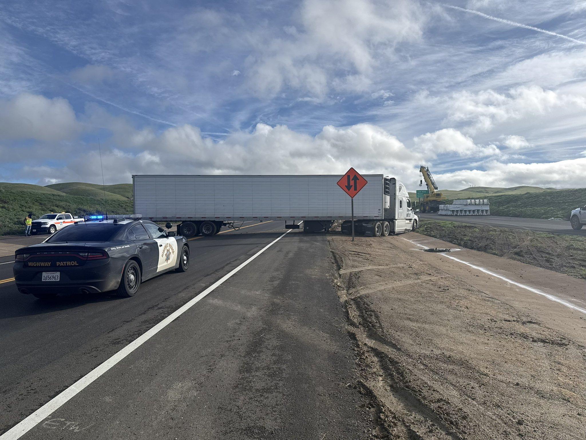 CHP said the incident happened around 9:51 a.m. on Highway 46 just east of Highway 41, where the big rig ended up stuck across the roadway while trying to turn around. CHP’s Templeton Office reported the truck’s axles became lodged in the mud, leaving the trailer blocking traffic and requiring a heavy-duty tow to pull it out.