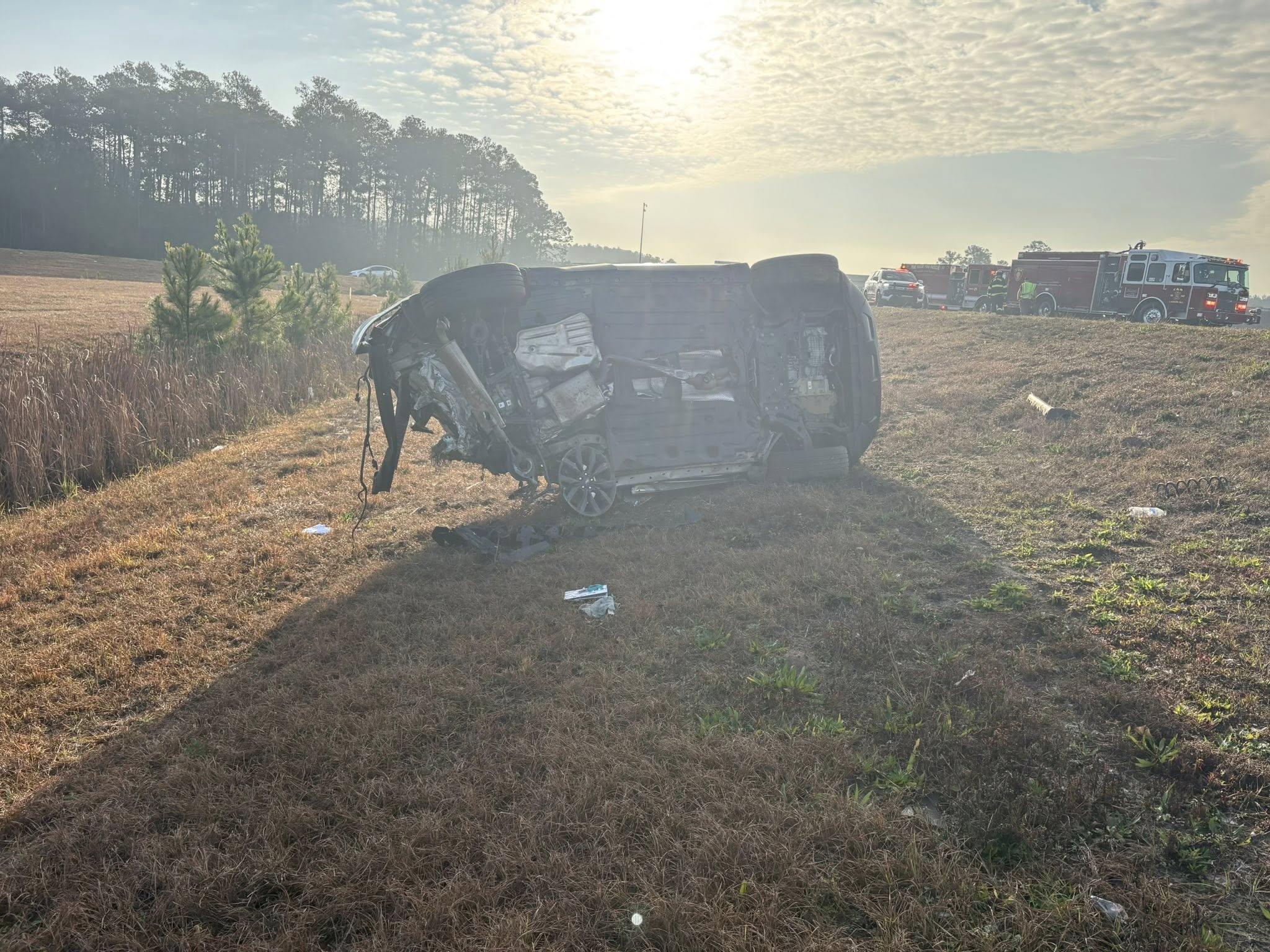 According to the C&B Fire Department, the crash involved an 18-wheeler that partially overturned down an embankment and an SUV that rolled over, sustaining heavy damage. Photos shared by the agency showed the SUV crumpled with extreme rear-end damage, exposing part of the interior, and the semi-truck’s cab appeared severely disfigured.