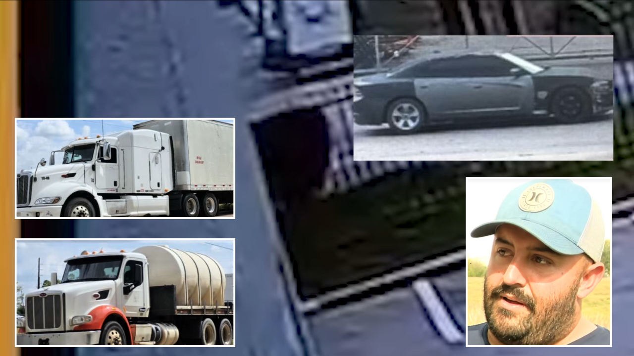 JERSEY VILLAGE, TEXAS — A Jersey Village man says two 18-wheelers he invested thousands of dollars into were stolen just days after Christmas, and surveillance video shows two suspects arriving in a Dodge Charger before leaving the area with one of the semis following closely behind.