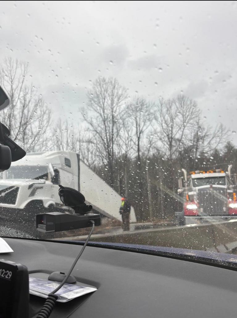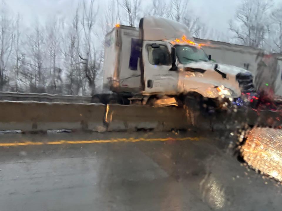 Troopers said the first crash happened around 4:37 a.m. when a westbound tractor-trailer lost control near Exit 37, ran off the roadway to the right, and struck a guardrail before going down an embankment.