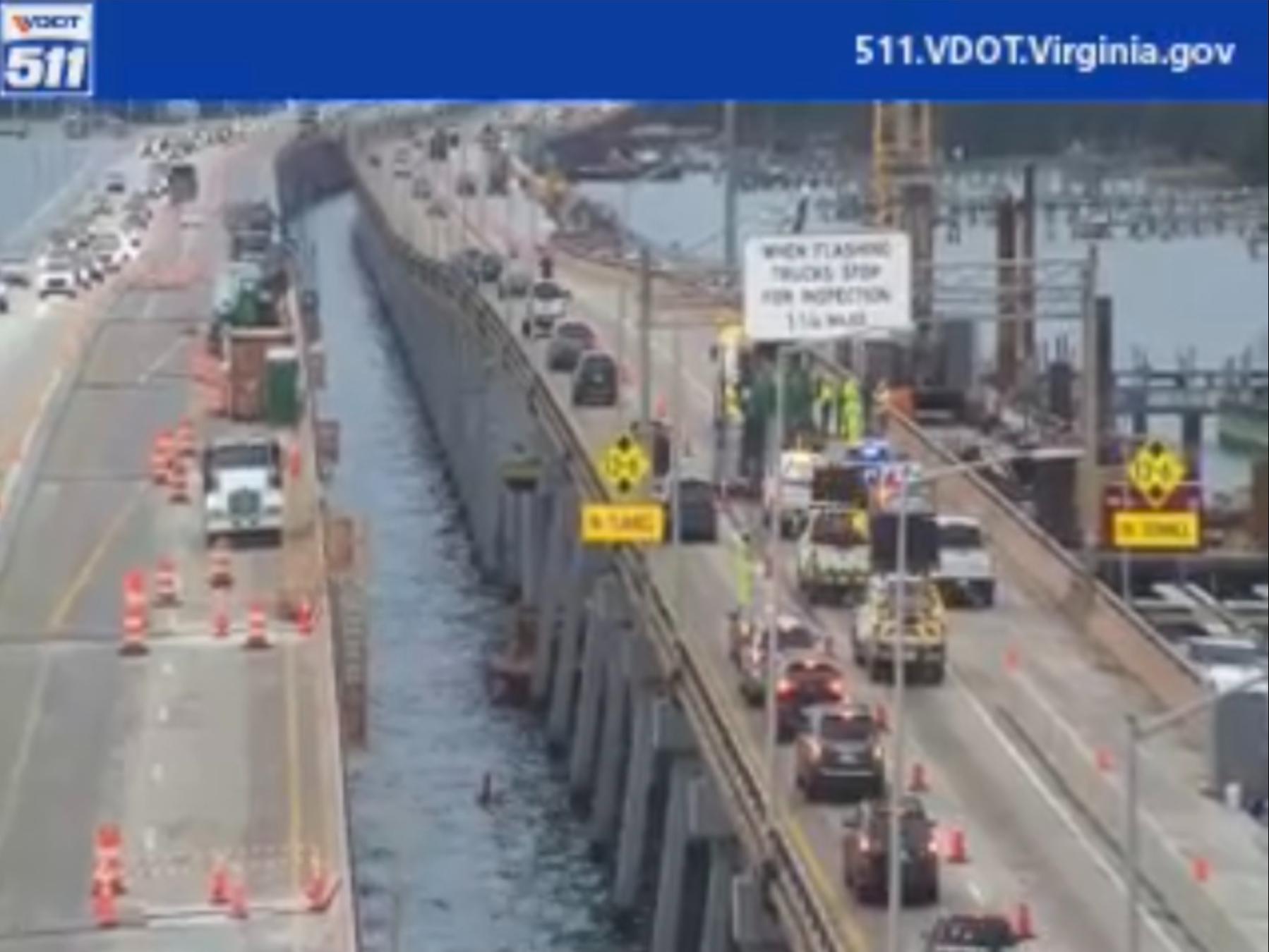 Tractor-trailer swerves, hits a work-zone safety attenuator near Hampton Roads Bridge Tunnel, causing a 6.25-mile traffic backup