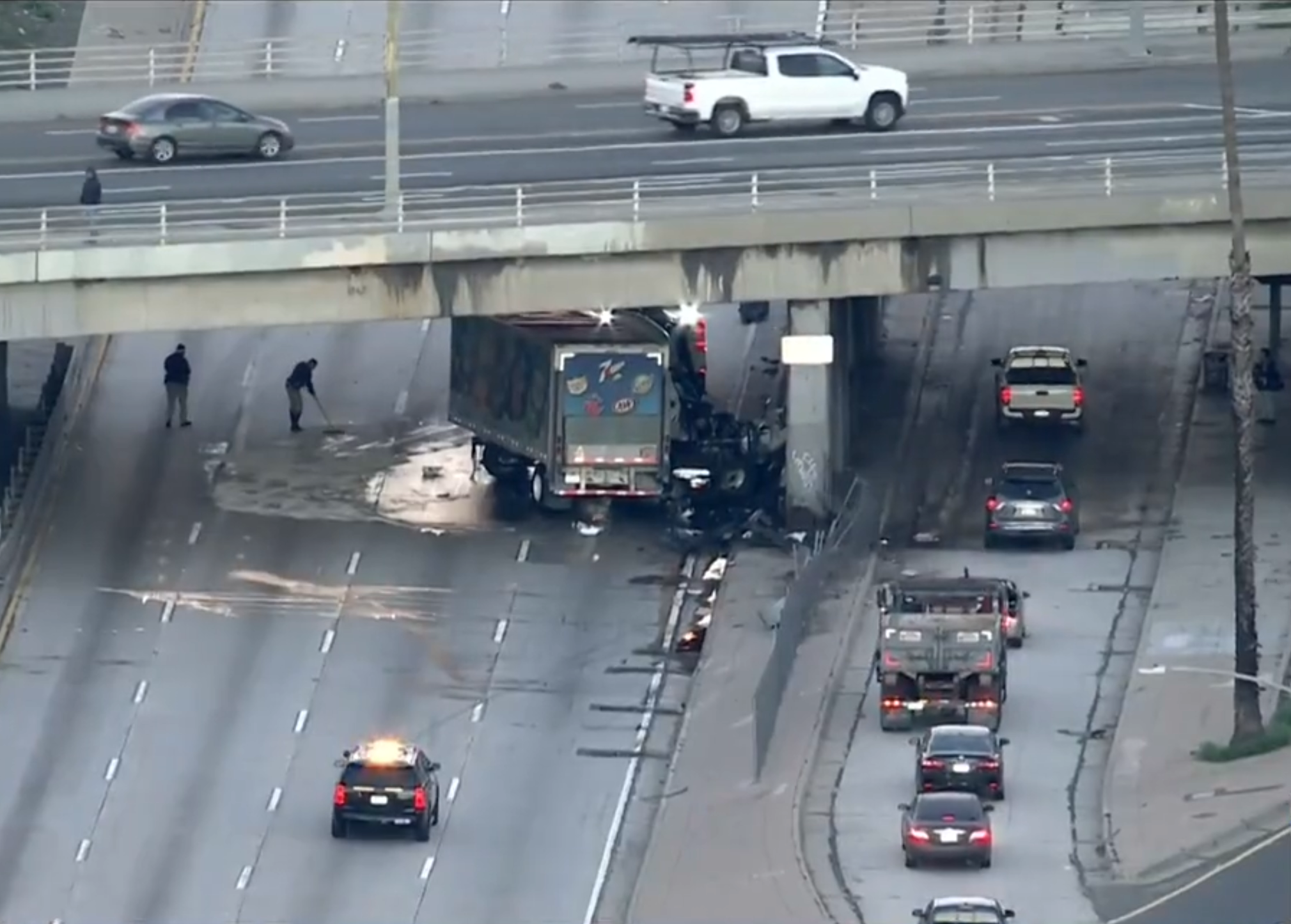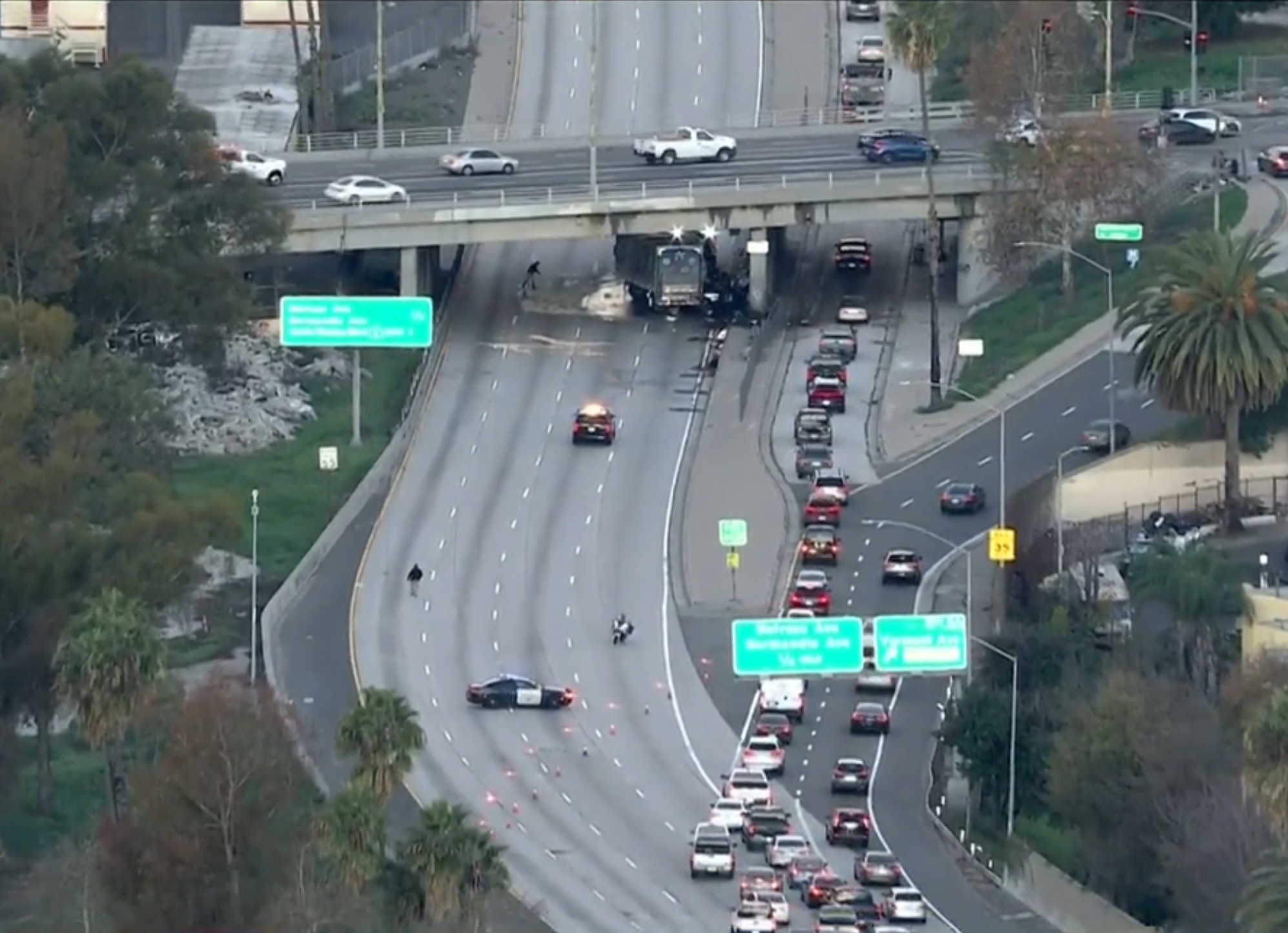 Sky5 video showed crews working the scene on the northbound 101 at Vermont Avenue around 7 a.m., where a jackknifed tractor-trailer and a smaller vehicle were involved. The smaller vehicle appeared to have caught fire.