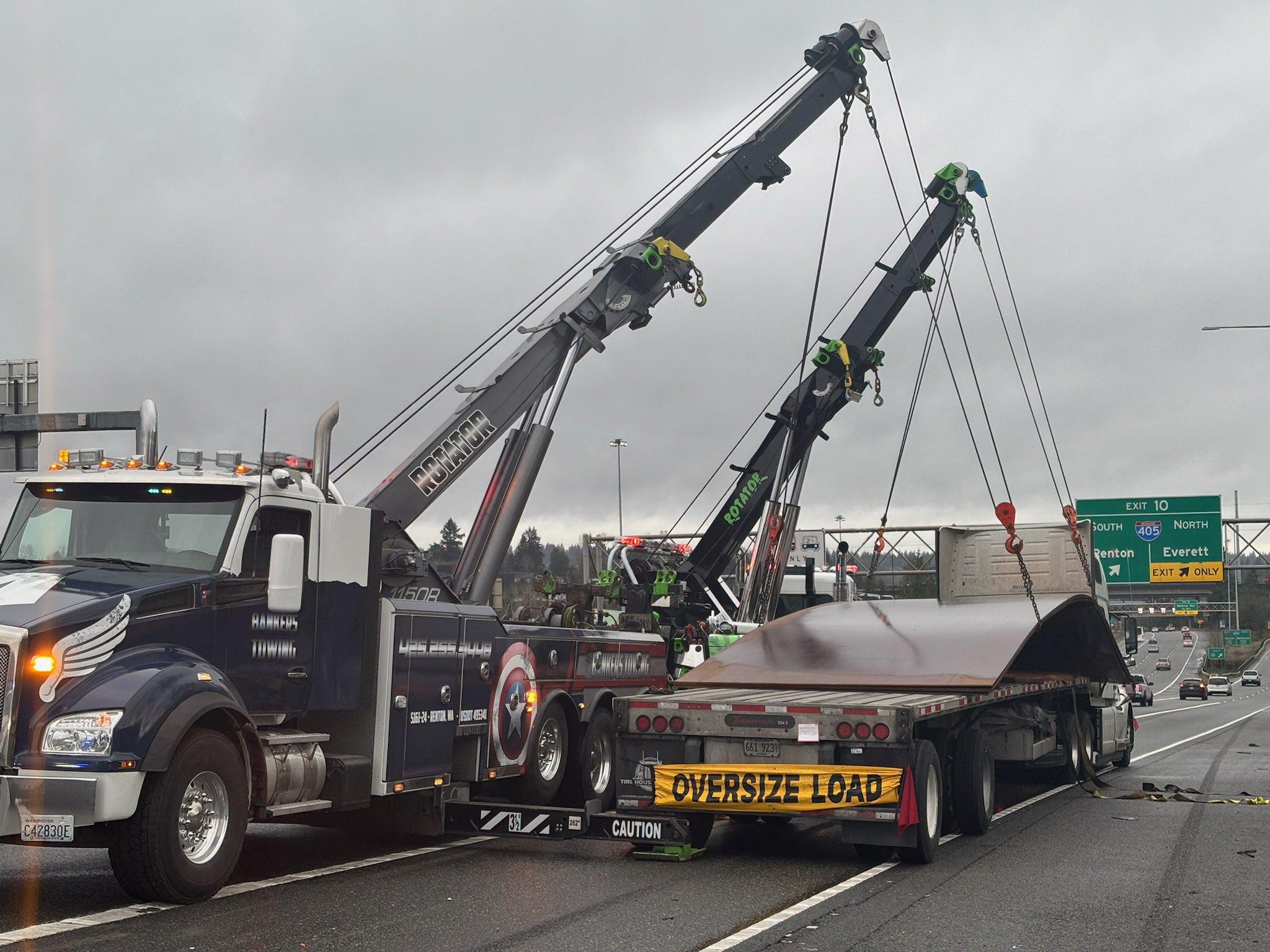 Washington State Patrol troopers responded on Jan. 12, 2026, to the connection from I-90 westbound to I-405 for a crash involving a commercial semi hauling an oversized load of metal sheets.